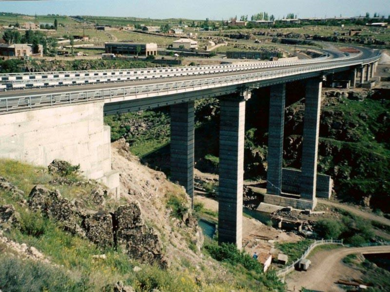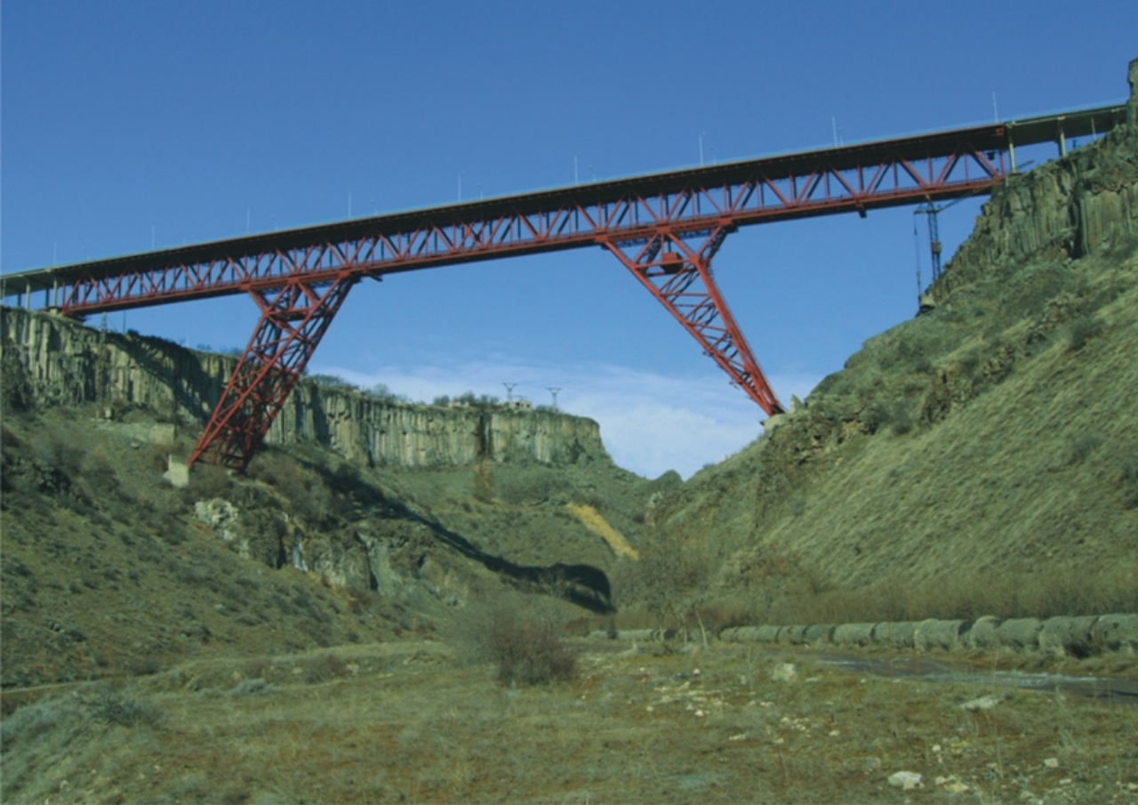 In 2000 bridge was put into operation. Length of the bridge-496m, width-32m (3.0+26.0+3.0). The bridge comprises 47.8+3x80+64m long metallic span construction, as well 4x28m long right-bank and 1x15m long left-bank viaducts. Height above the water level of the river Hrazdan -92m. Traffic part of the metallic span construction is carried out by the orthotropic slab. The high piers are assembled from box-like, reinforced concrete 5.0x3.8x1.2m and 0.35m thick blocks that are made from B40 class concrete. The high piers were preliminary strained with steel high-strength reinforsing ropes. Precast concrete- 4690m3 Monolithic reinforced concrete- 9100m3 Metal constructions-4555t Traffic part area-15900m2