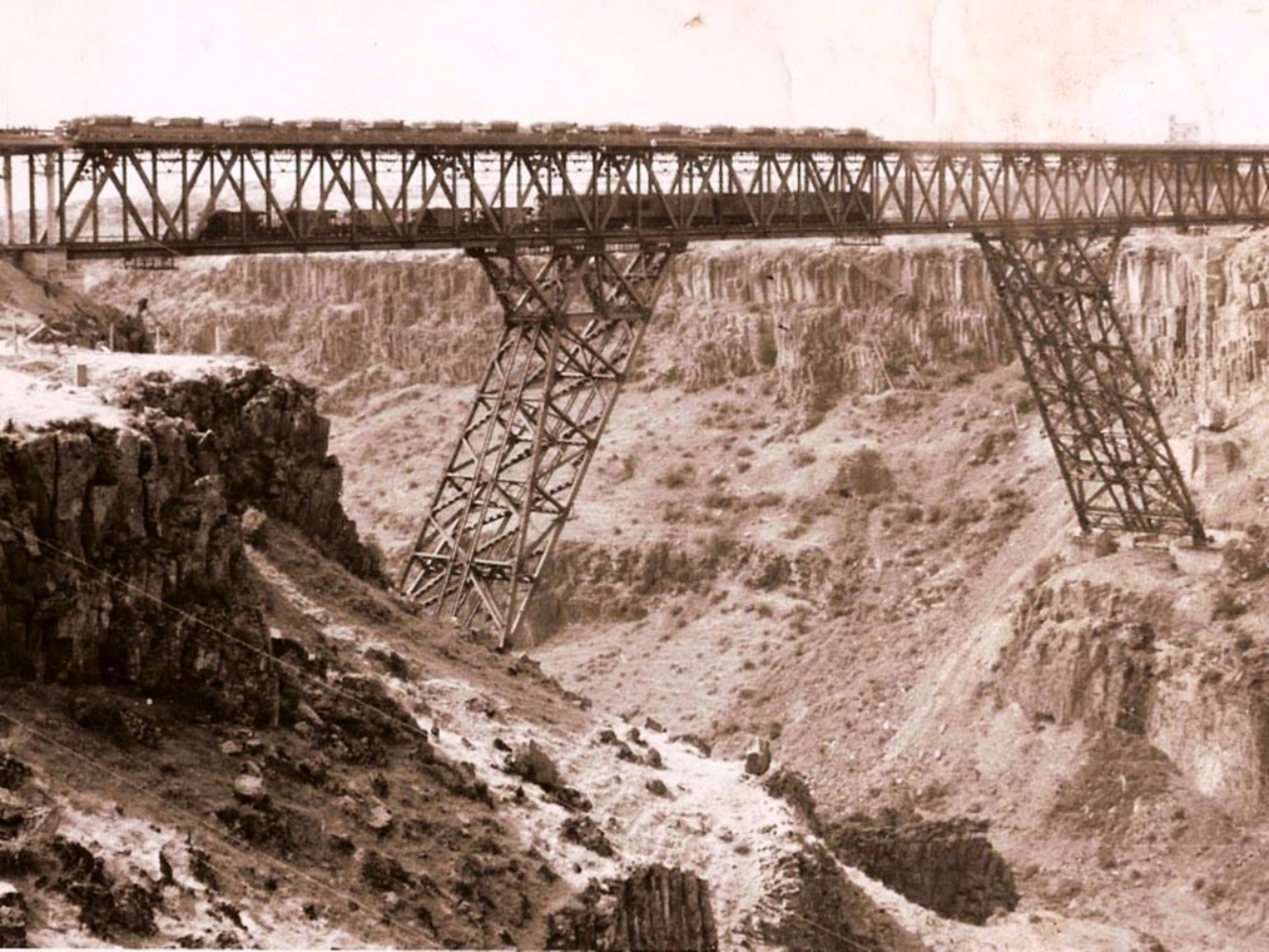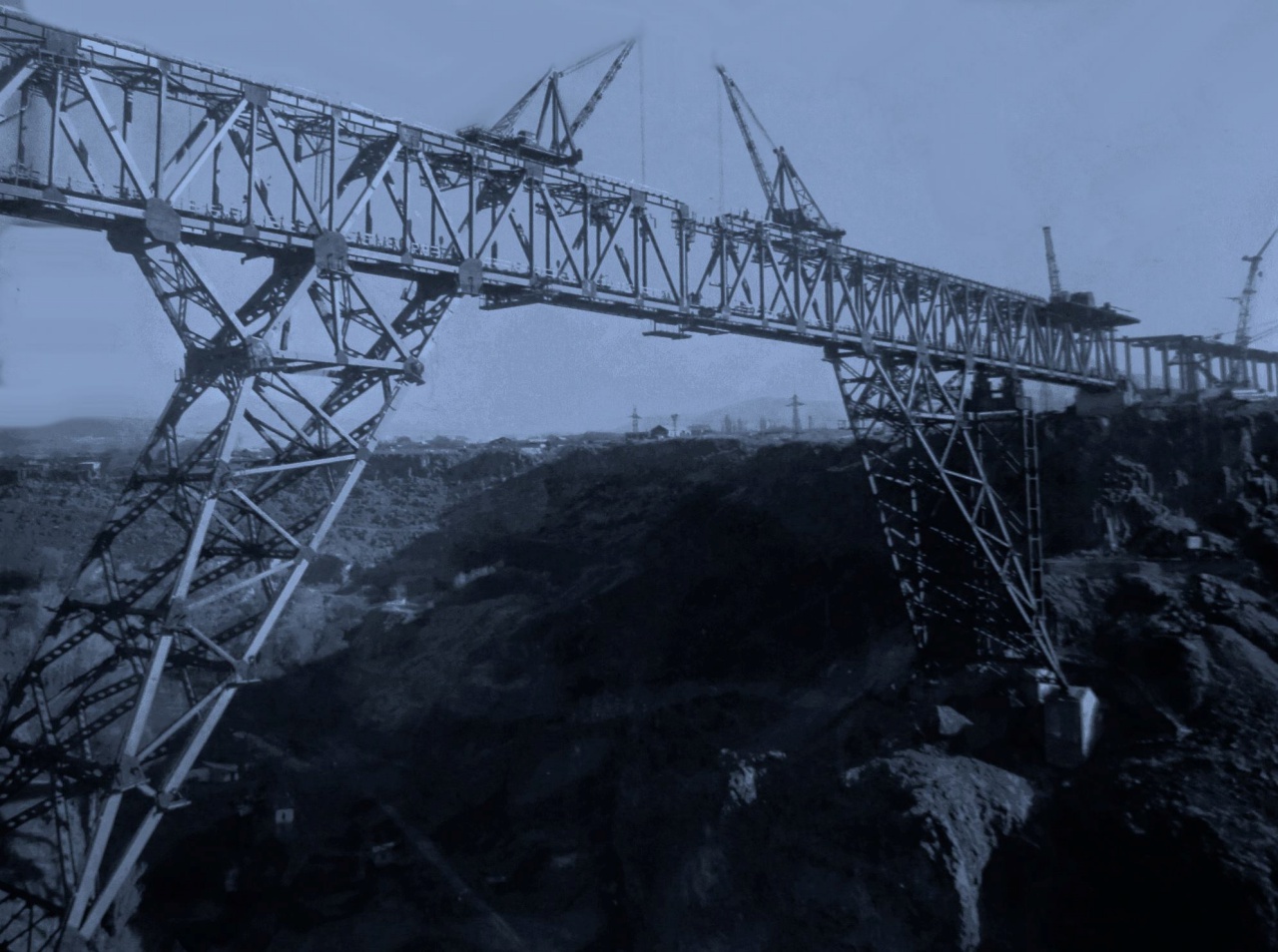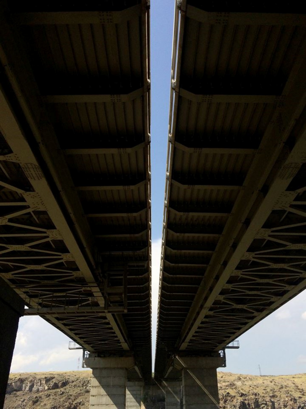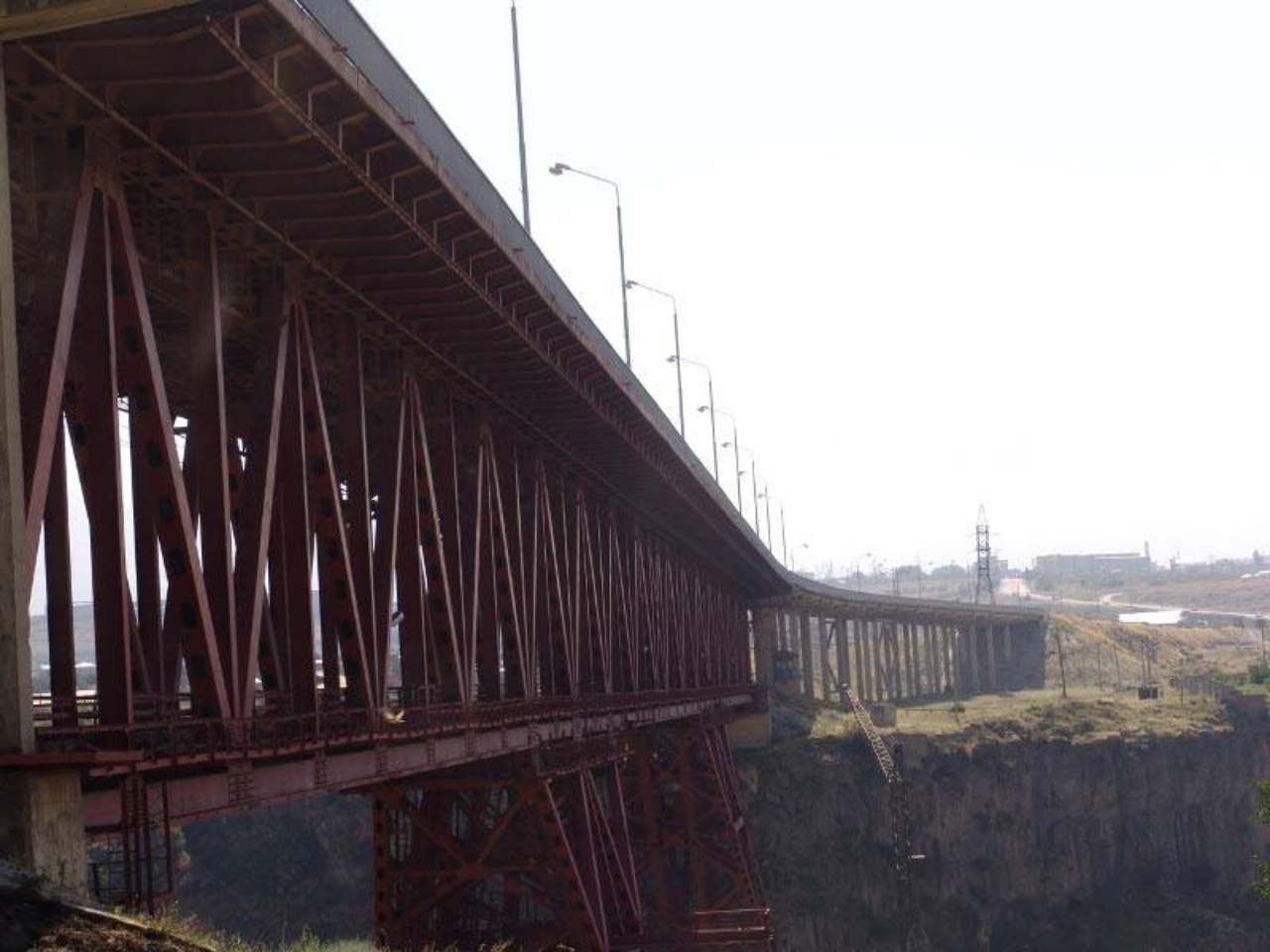 In 1981 the bridge was put into operation. Length of the bridge -640m, width -14.5m (1.5+11.5+1.5). The bridge comprises 272.5m long metallic span construction, as well 13x12m long right-bank and 16x12m long left-bank viaducts. Height above the water level of the river Hrazdan -121m. The bridge is two-storied, the first storey serving as a railway and the second as a main road. Metal span construction is designed by "running deer" scheme. Precast concrete-2800m3 Monolithic concrete -12800m3 Metal constructions- 4650tn Traffic part area-9610m2