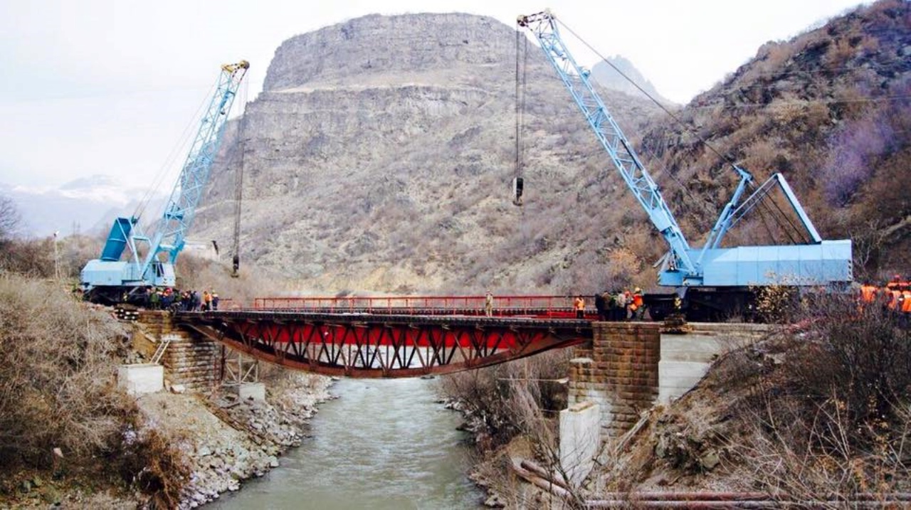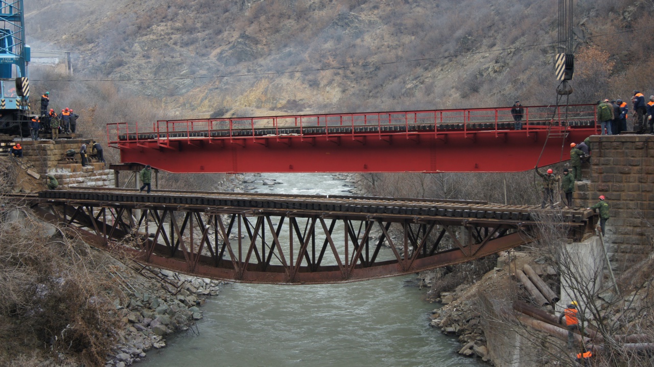 Triple-span metal bridge at km 2626+816.6 South-Caucasus railway The bridge was built in 1898. The material of the span - wrought iron. During the exploitation the elements of the span have been seriously damaged and corroded. Meanwhile, rail load has significantly increased in comparison with the standards for more than 100 years ago. Since May 2012 Kamurjshin CJSC is working to reconstruct stables and replace the old span by the new one. The new span designed by modern rail loading C-14. The work have been finished at the end of 2012.