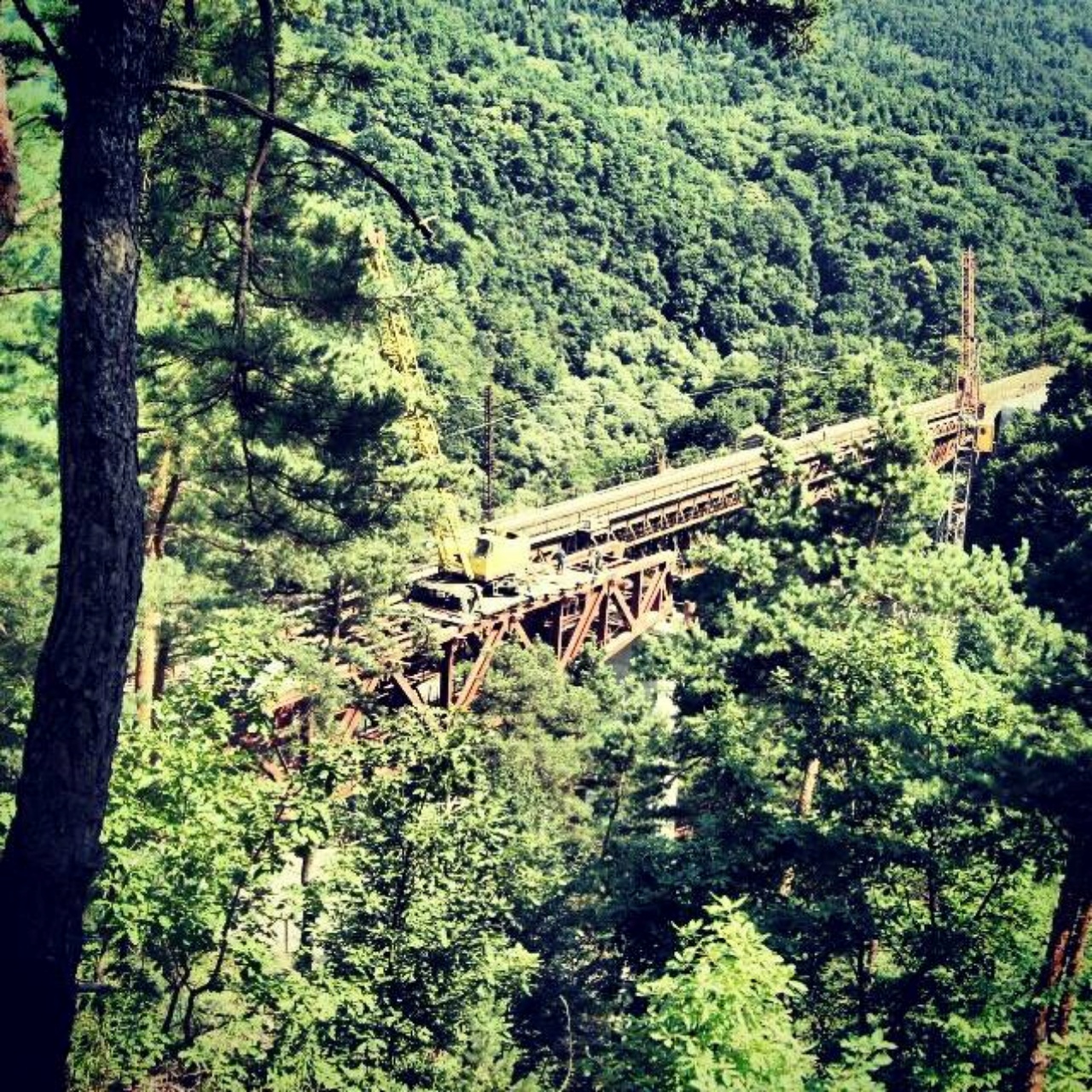 In 1985 bridge was put into operation. Length of the bridge-158m.Longitudinal scheme-45+55+45m,with metallic span construction and reinforced concrete ballast slabs. Height of piers-45m. Precast concrete-3800m3 Monolithic concrete - 3800m3 Metallic construction - 350tn