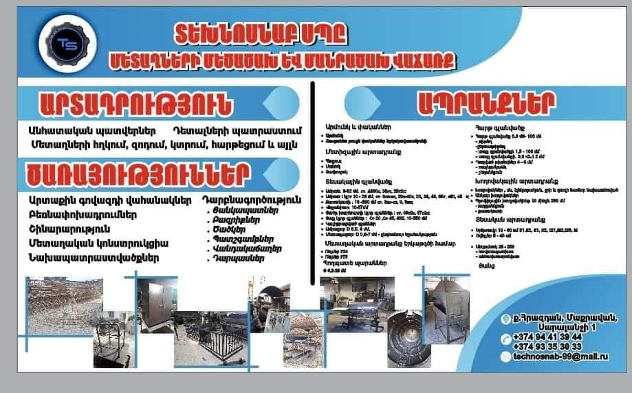TEKHNOSNAB LLC is one of best metalworking / manufacturing, processing and trading companies in Hrazdan city of Kotayk region of Armenia. The company is actively engaged in wholesale and retail trade in metal products, building materials, spare parts, as well as their production.