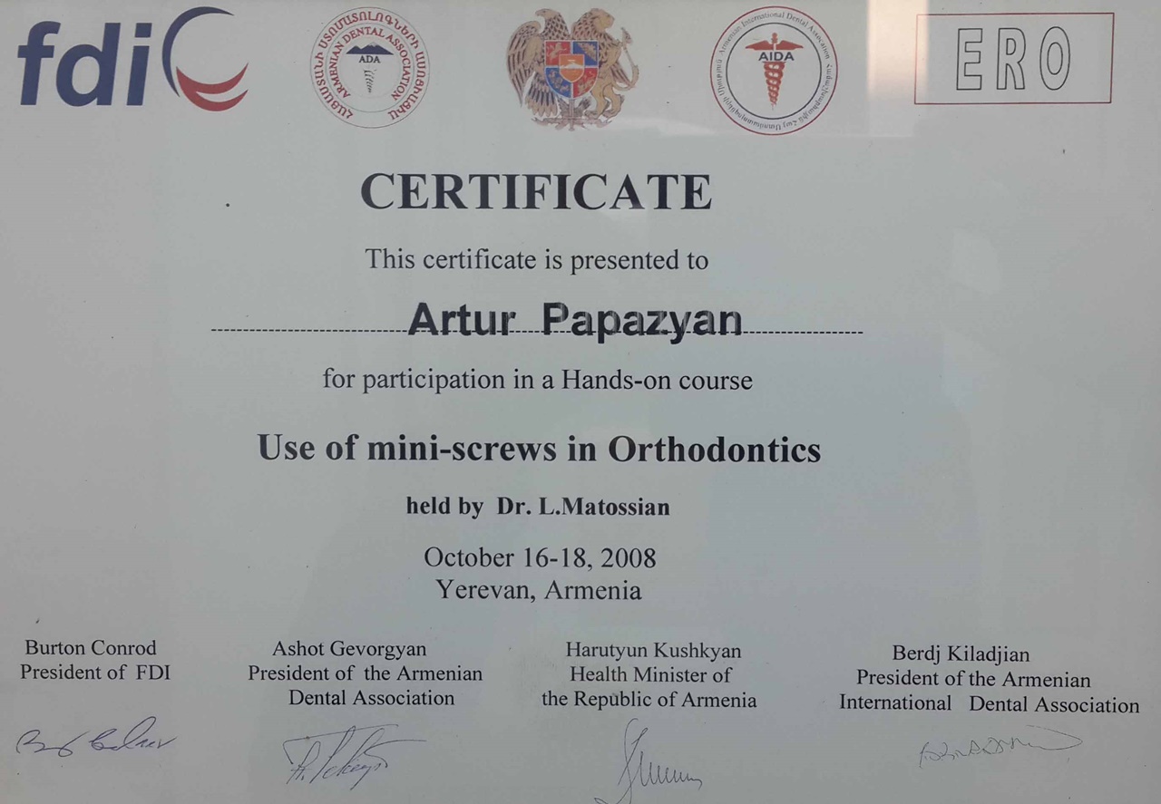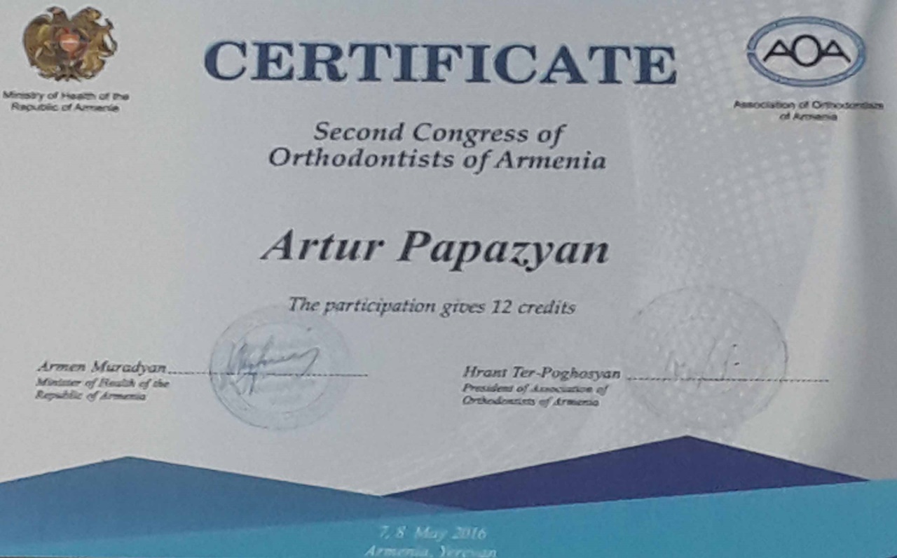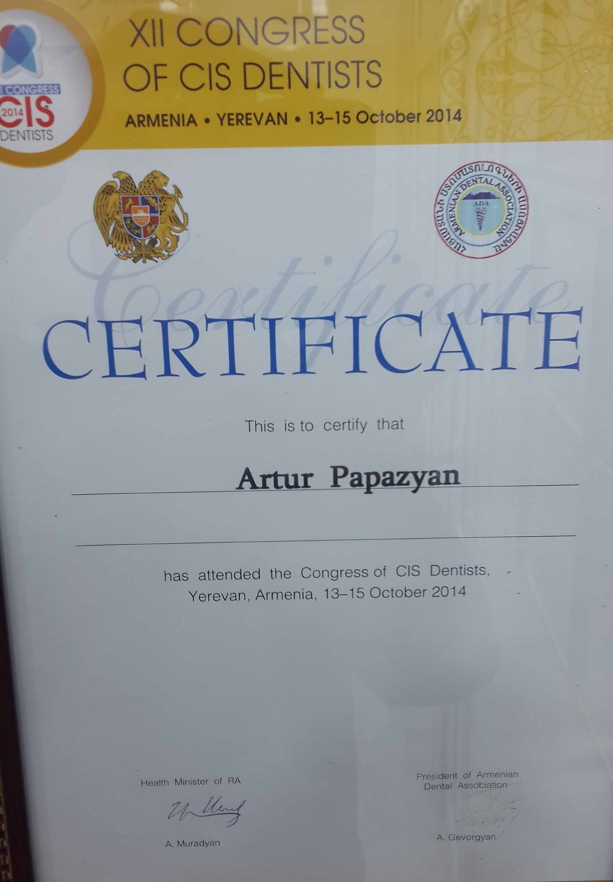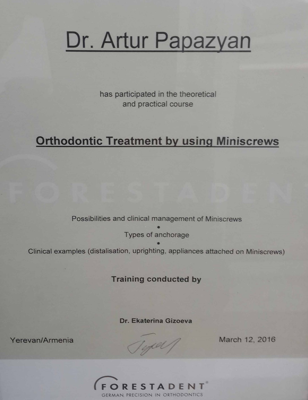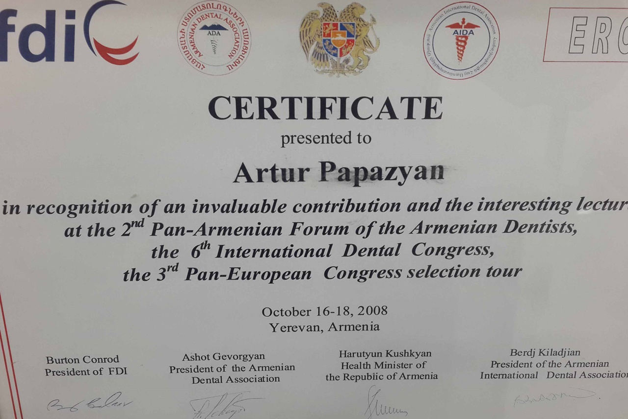 In 2003, Dr. Arthur Papazyan accomplished his scientific thesis on “Functional state of periodontal and implementation of laser raying in orthodontic treatment”, and received his PhD successfully. In 2009, he completed his doctoral thesis on Clinical and Diagnostic Aspects of Orthodontic Treatment of Distal Oxygen. .