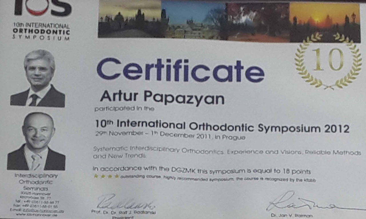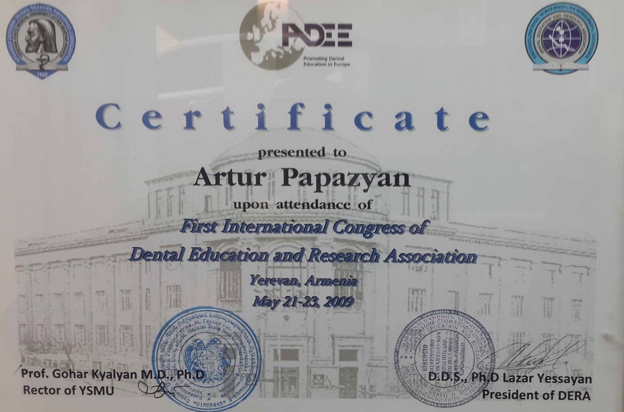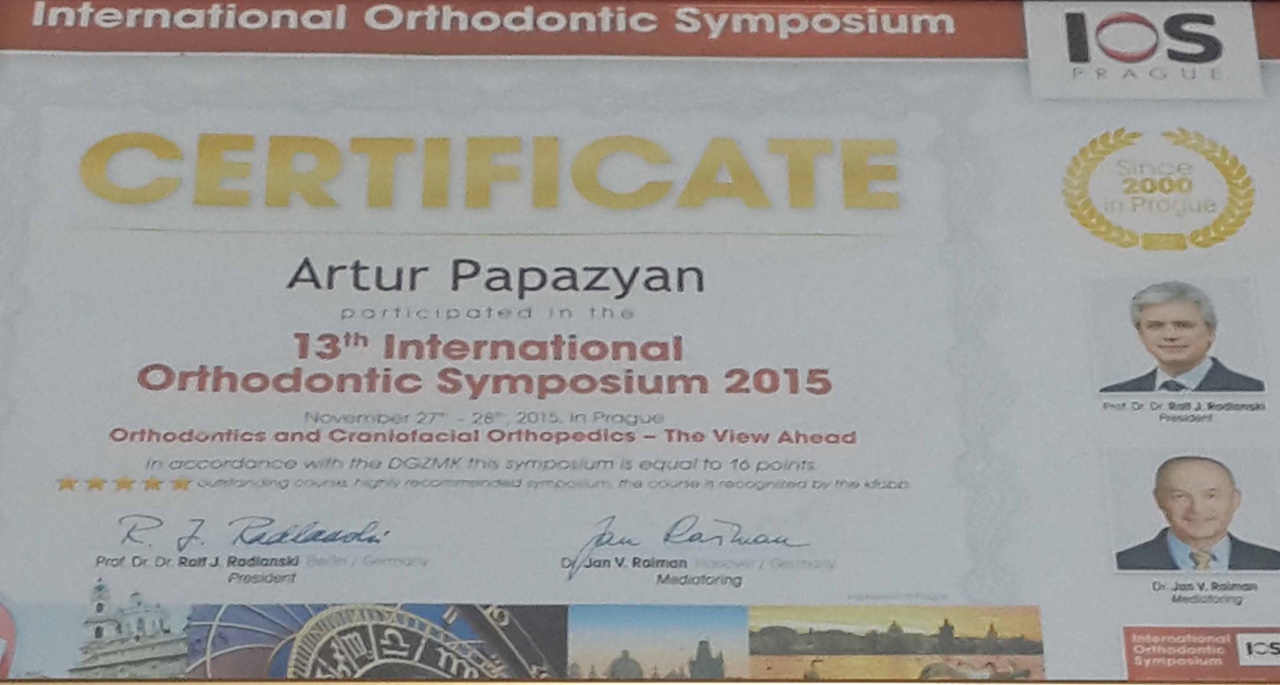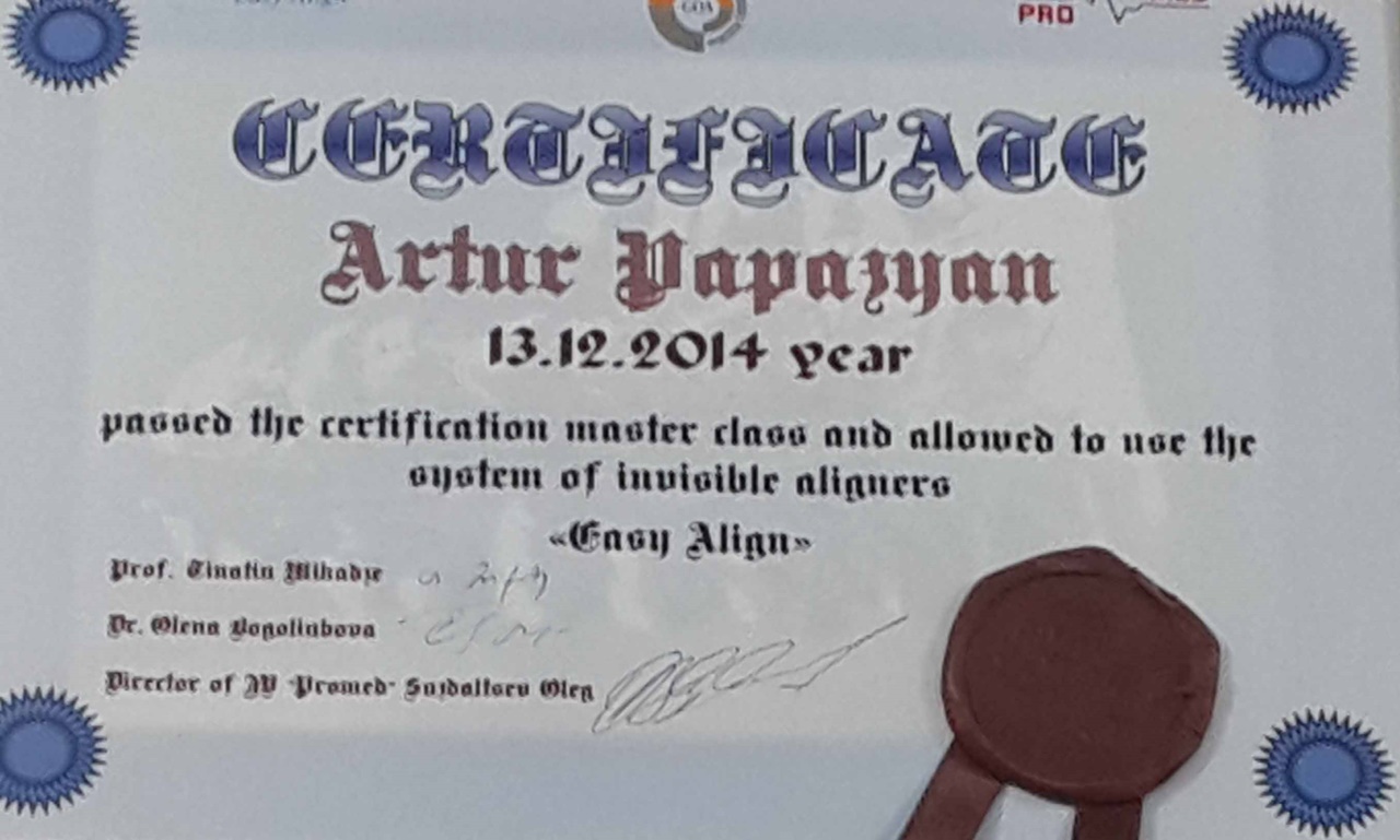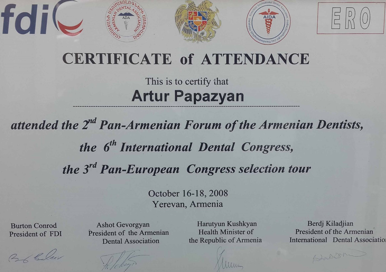 In 2003, Dr. Arthur Papazyan accomplished his scientific thesis on “Functional state of periodontal and implementation of laser raying in orthodontic treatment”, and received his PhD successfully. In 2009, he completed his doctoral thesis on Clinical and Diagnostic Aspects of Orthodontic Treatment of Distal Oxygen. .