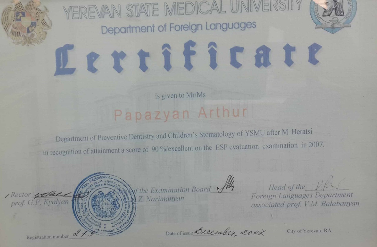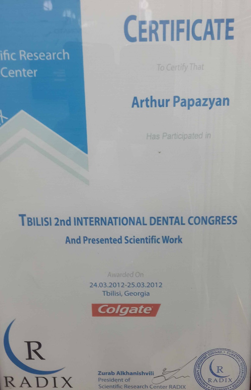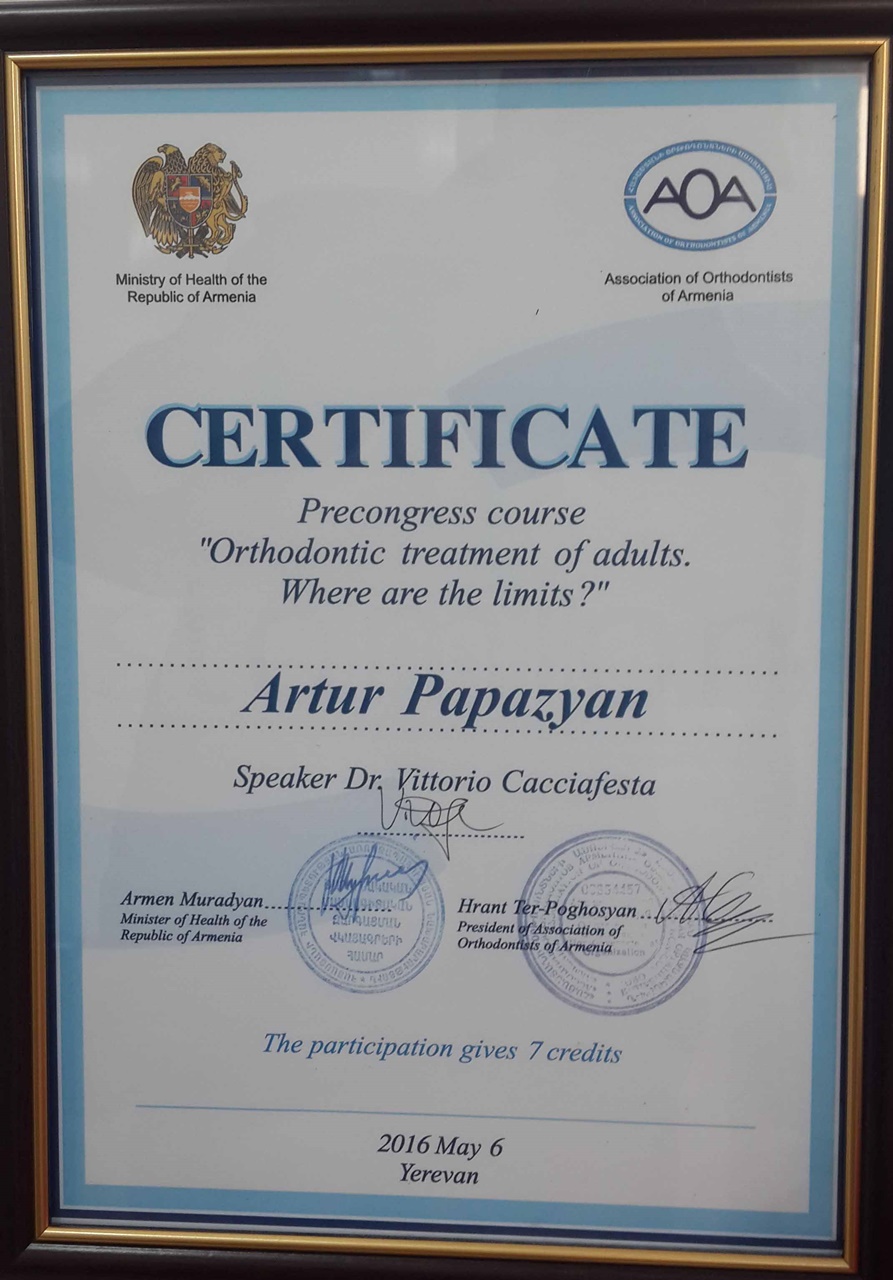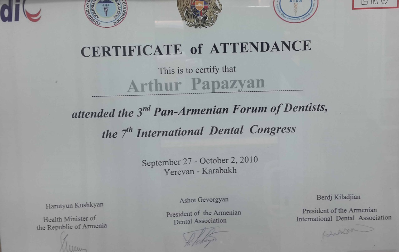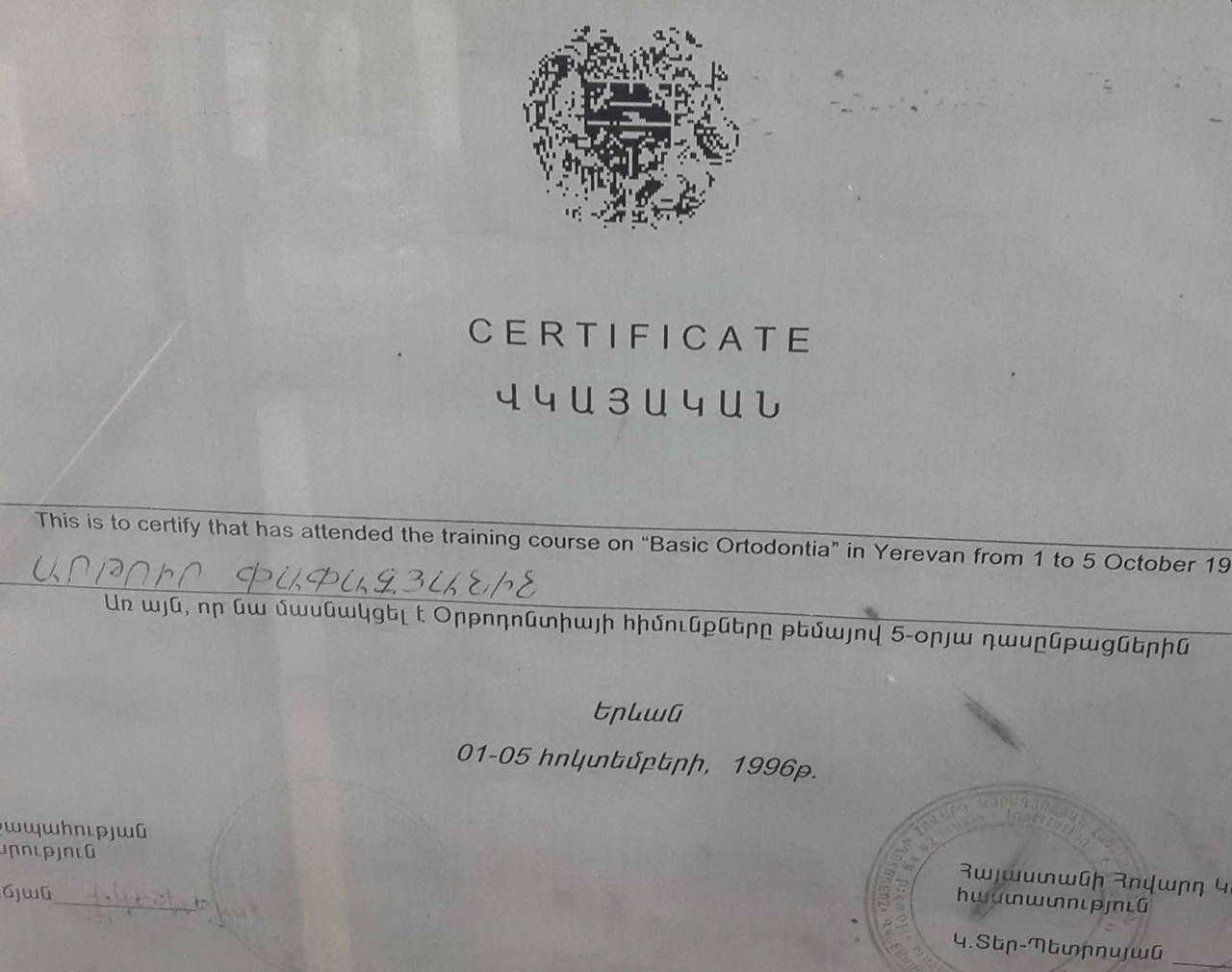 In 2003, Dr. Arthur Papazyan accomplished his scientific thesis on “Functional state of periodontal and implementation of laser raying in orthodontic treatment”, and received his PhD successfully. In 2009, he completed his doctoral thesis on Clinical and Diagnostic Aspects of Orthodontic Treatment of Distal Oxygen. .