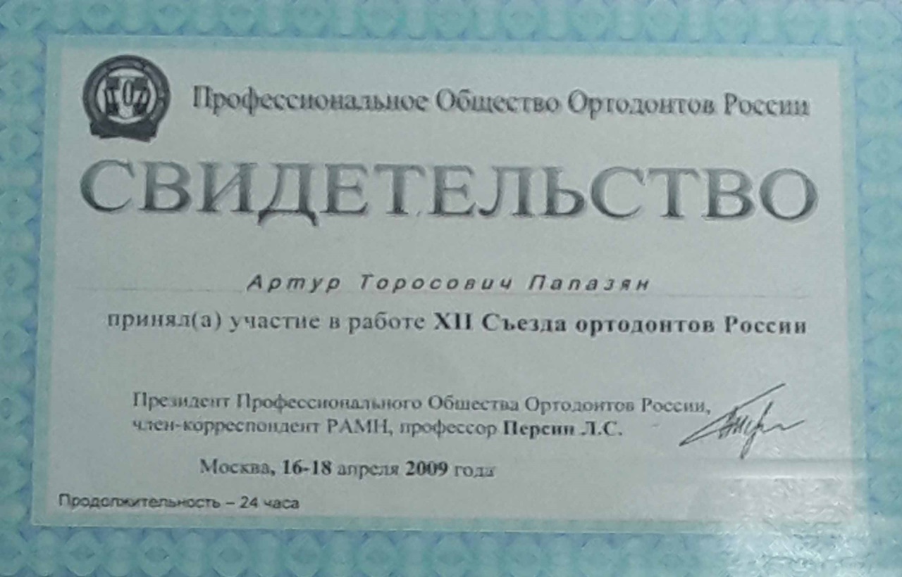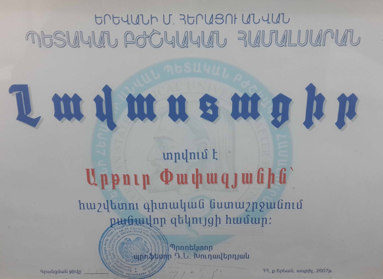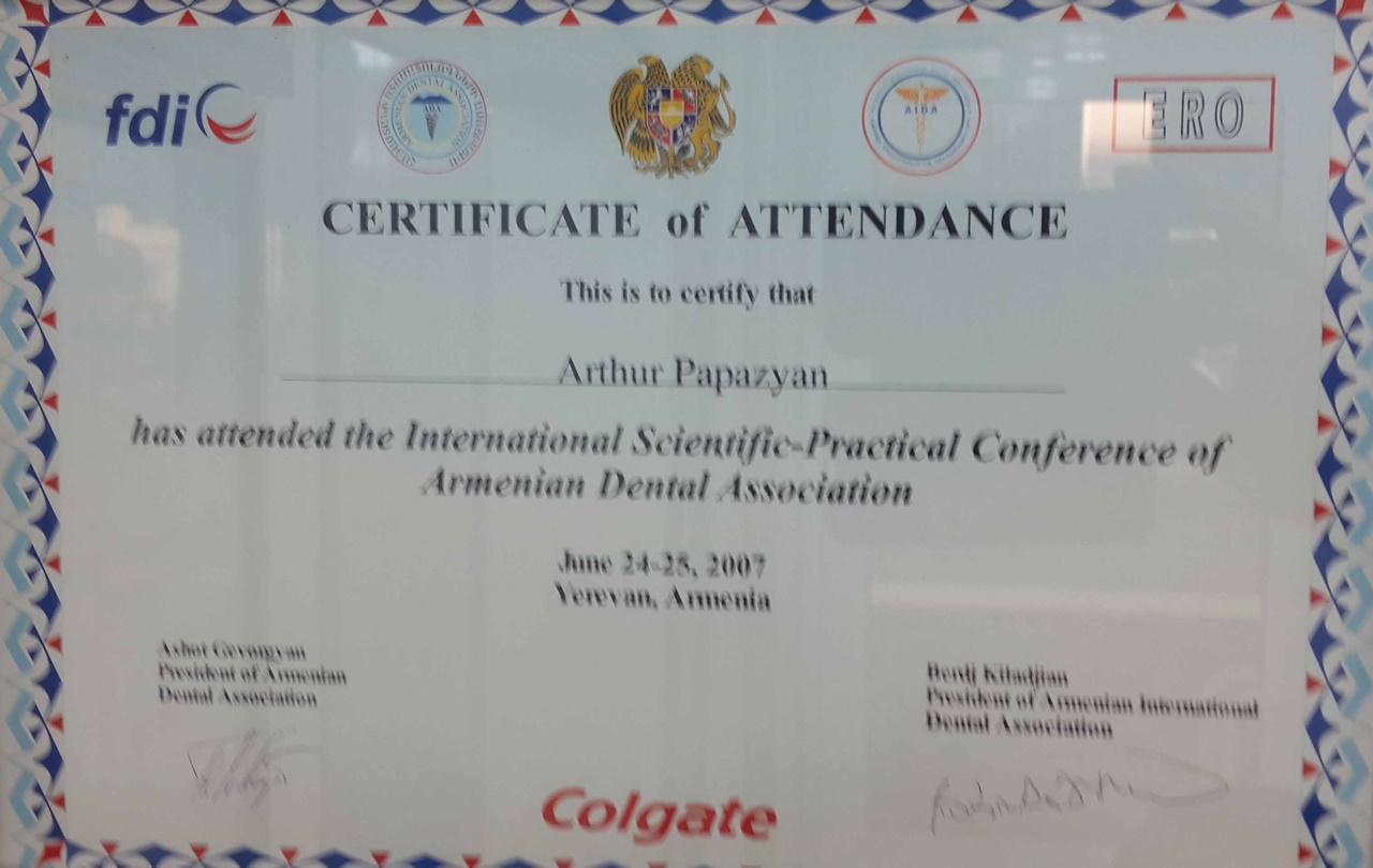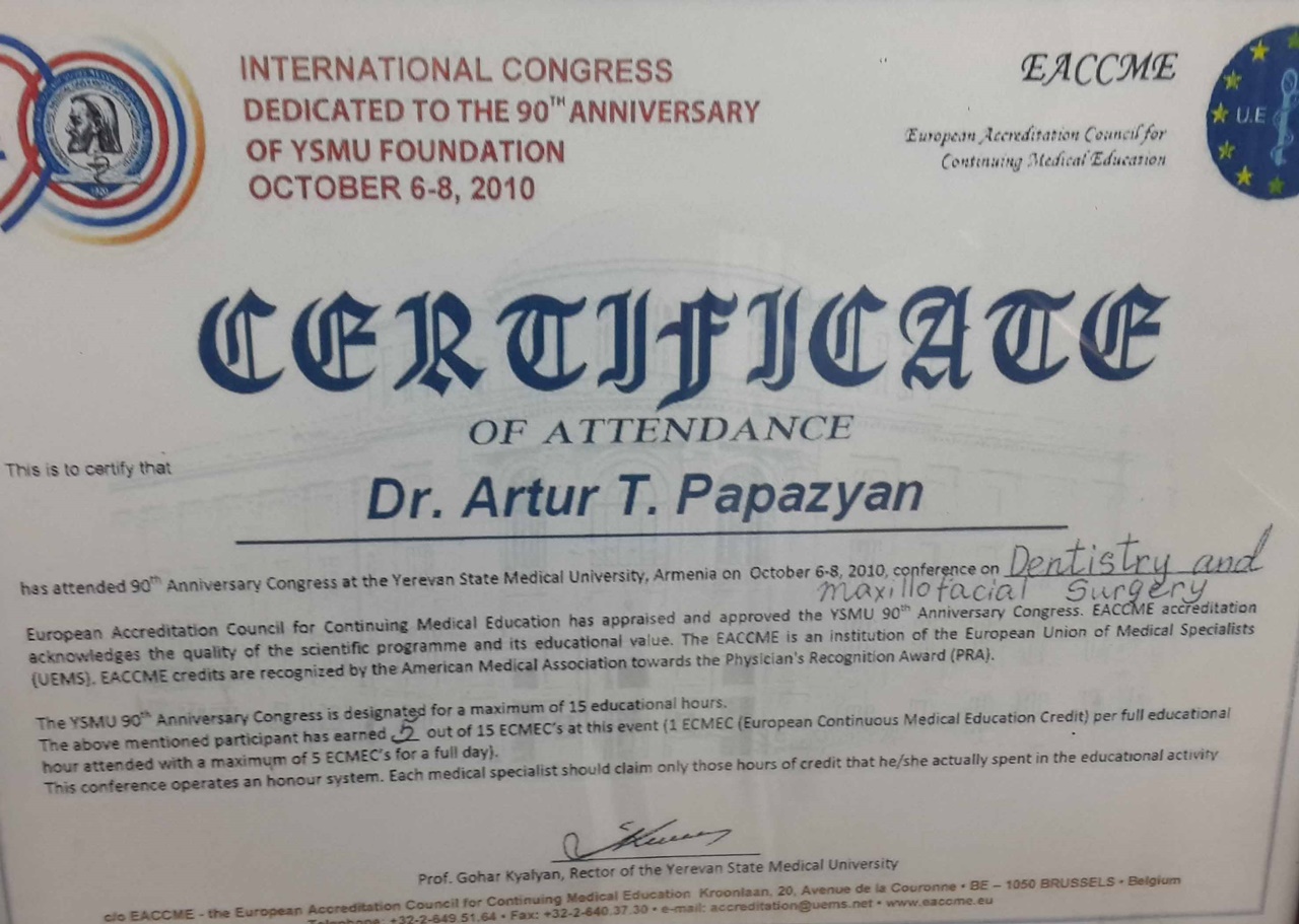 In 2003, Dr. Arthur Papazyan accomplished his scientific thesis on “Functional state of periodontal and implementation of laser raying in orthodontic treatment”, and received his PhD successfully. In 2009, he completed his doctoral thesis on Clinical and Diagnostic Aspects of Orthodontic Treatment of Distal Oxygen. .