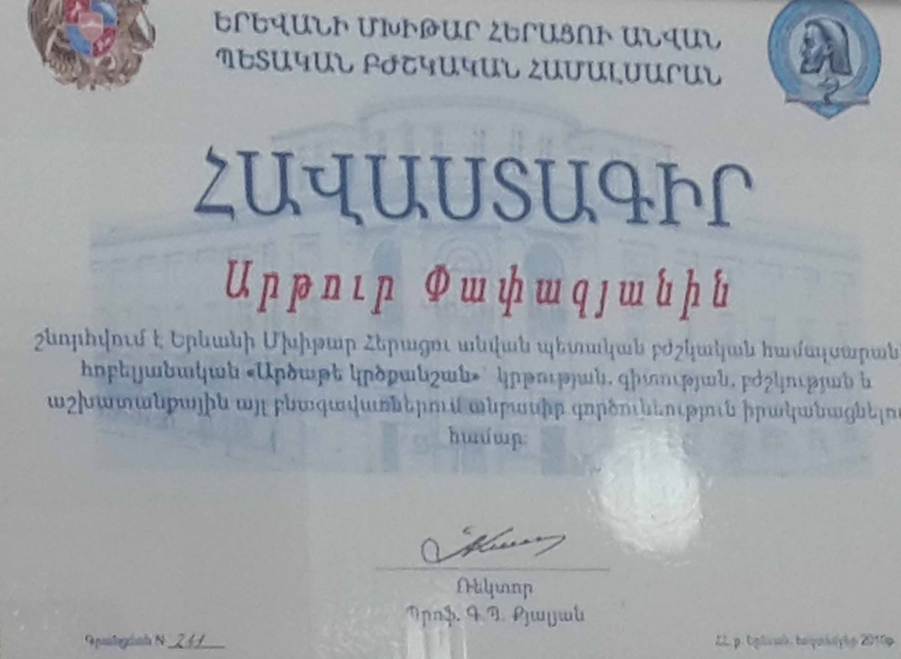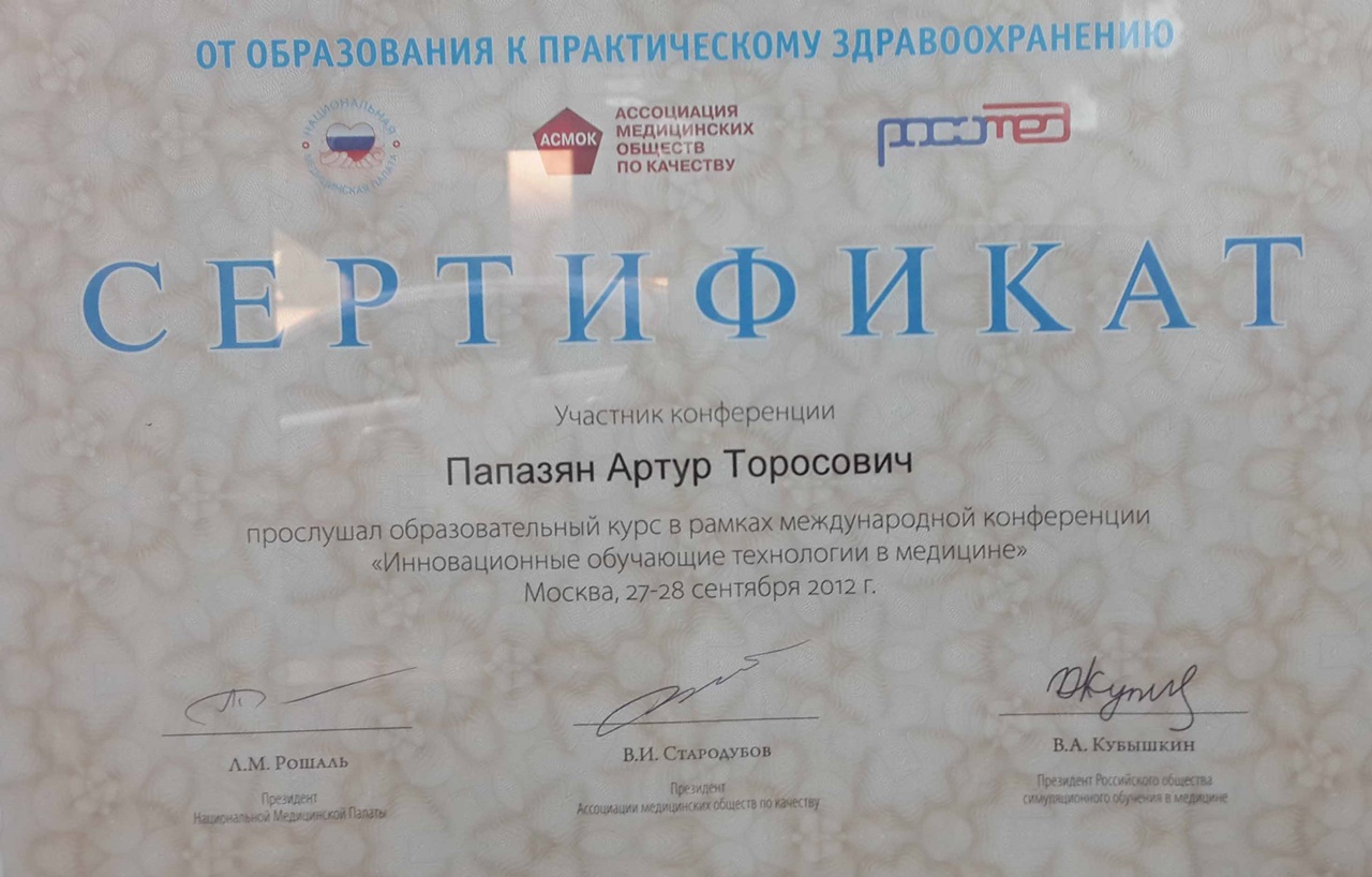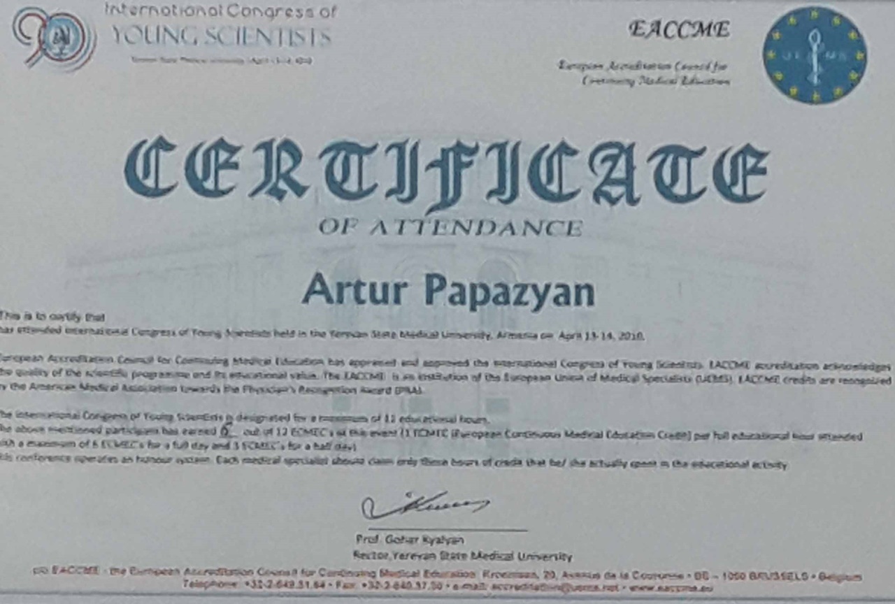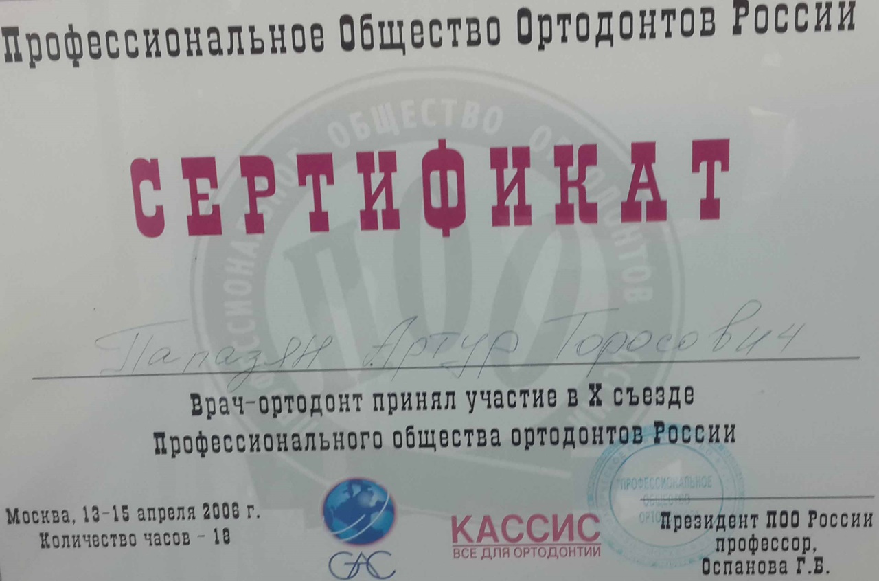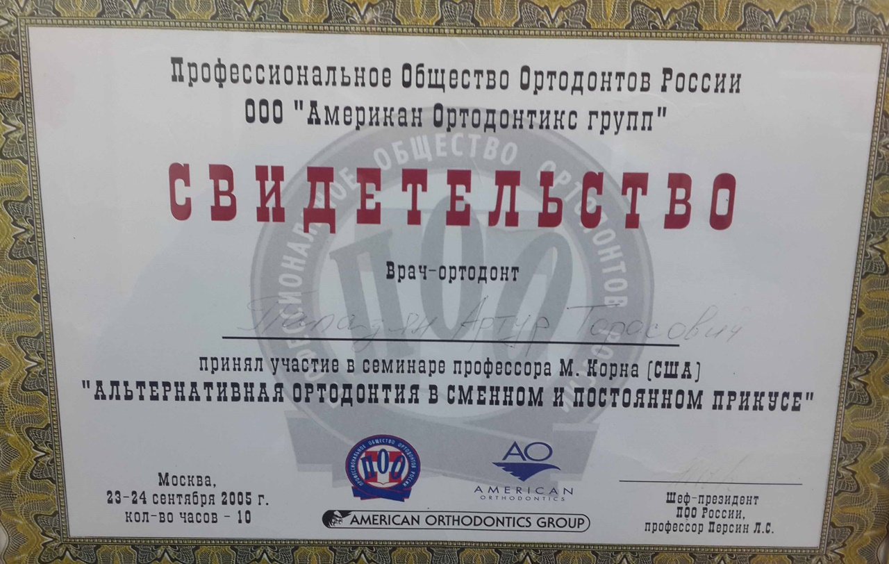 In 2003, Dr. Arthur Papazyan accomplished his scientific thesis on “Functional state of periodontal and implementation of laser raying in orthodontic treatment”, and received his PhD successfully. In 2009, he completed his doctoral thesis on Clinical and Diagnostic Aspects of Orthodontic Treatment of Distal Oxygen. .