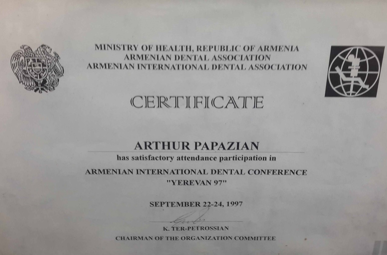 Dr. Arthur Toros Papazyan graduated from the Department of Dentistry of the Yerevan State Medical University after Mkhitar Heratsi with honors, in 1994, and the Clinical Residency at the Chair of Pediatric Dentistry, with honors, in 1997. Further education and major training includes: