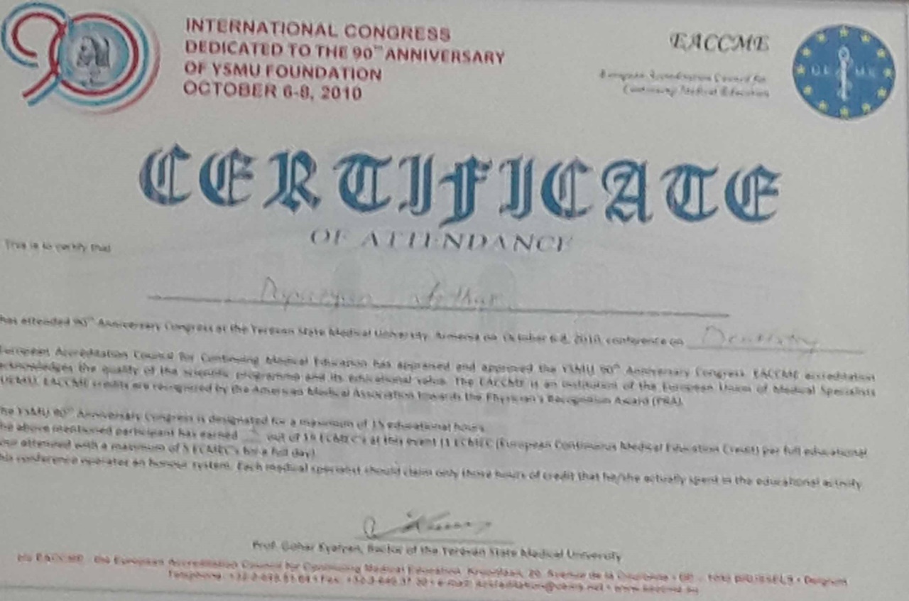 - Orthodontics, Yerevan State Medical University after Mkhitar Heratsi - 2009