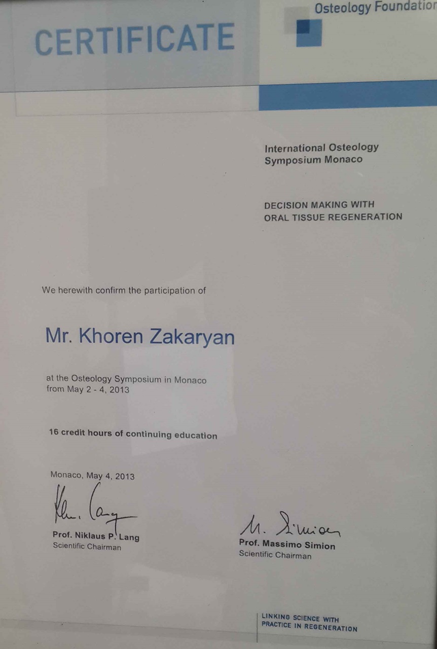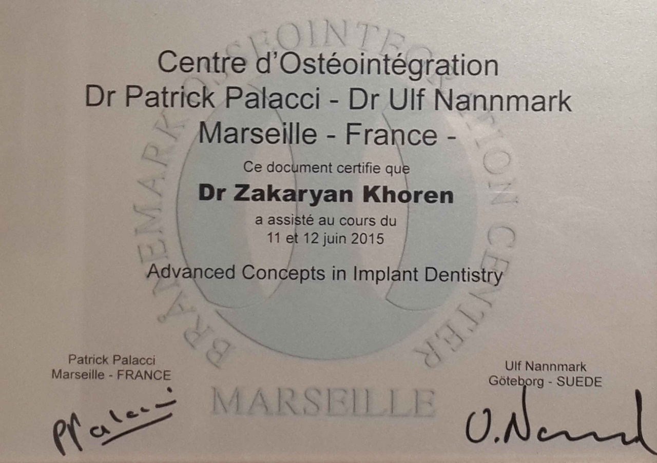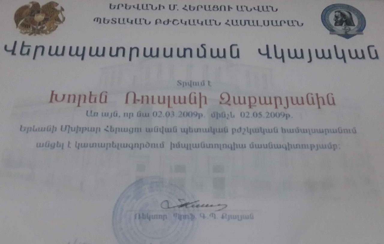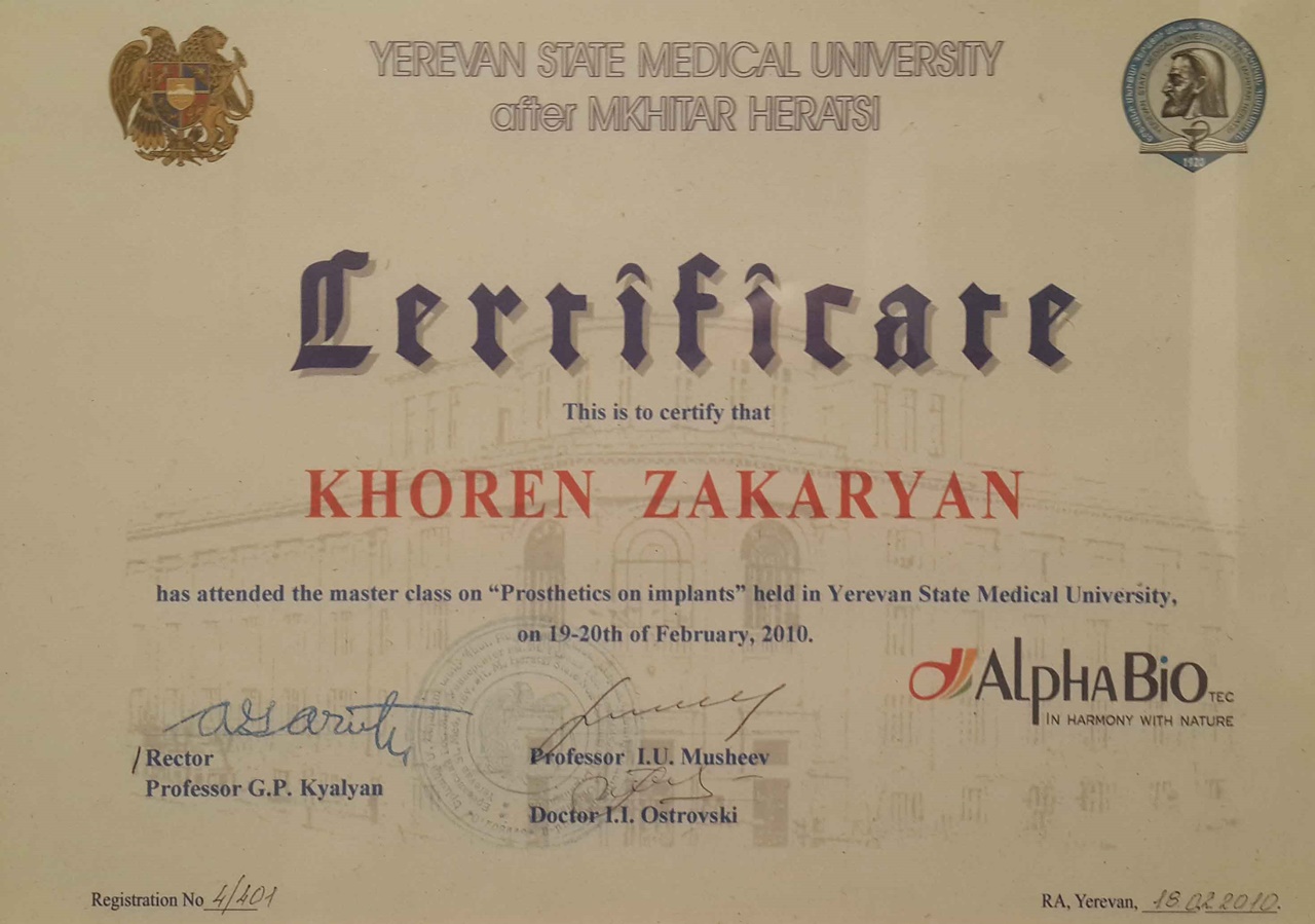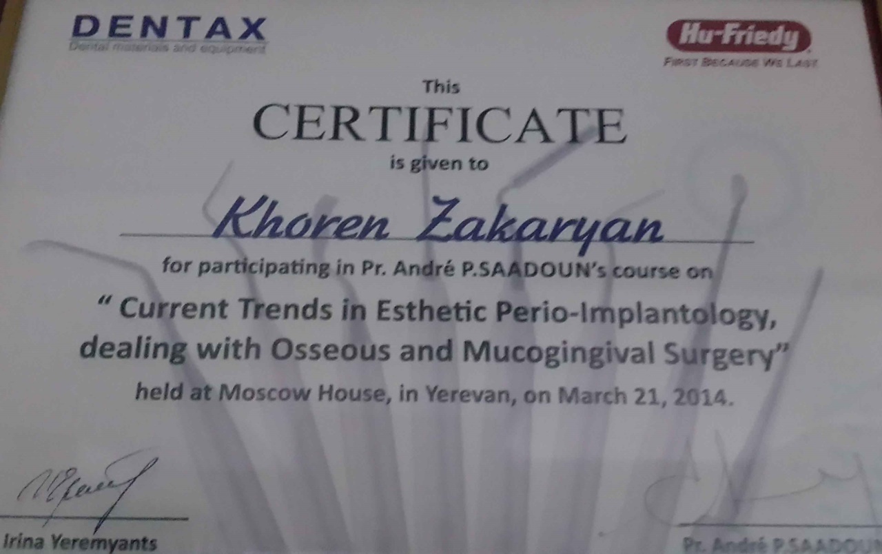 Dr. Khoren Ruslan Zakaryan graduated from the Department of Dentistry of the Yerevan State Medical University after Mkhitar Heratsi, in 1988, and the Clinical Residency at the same Department, in 1989. Further education and major training includes:
