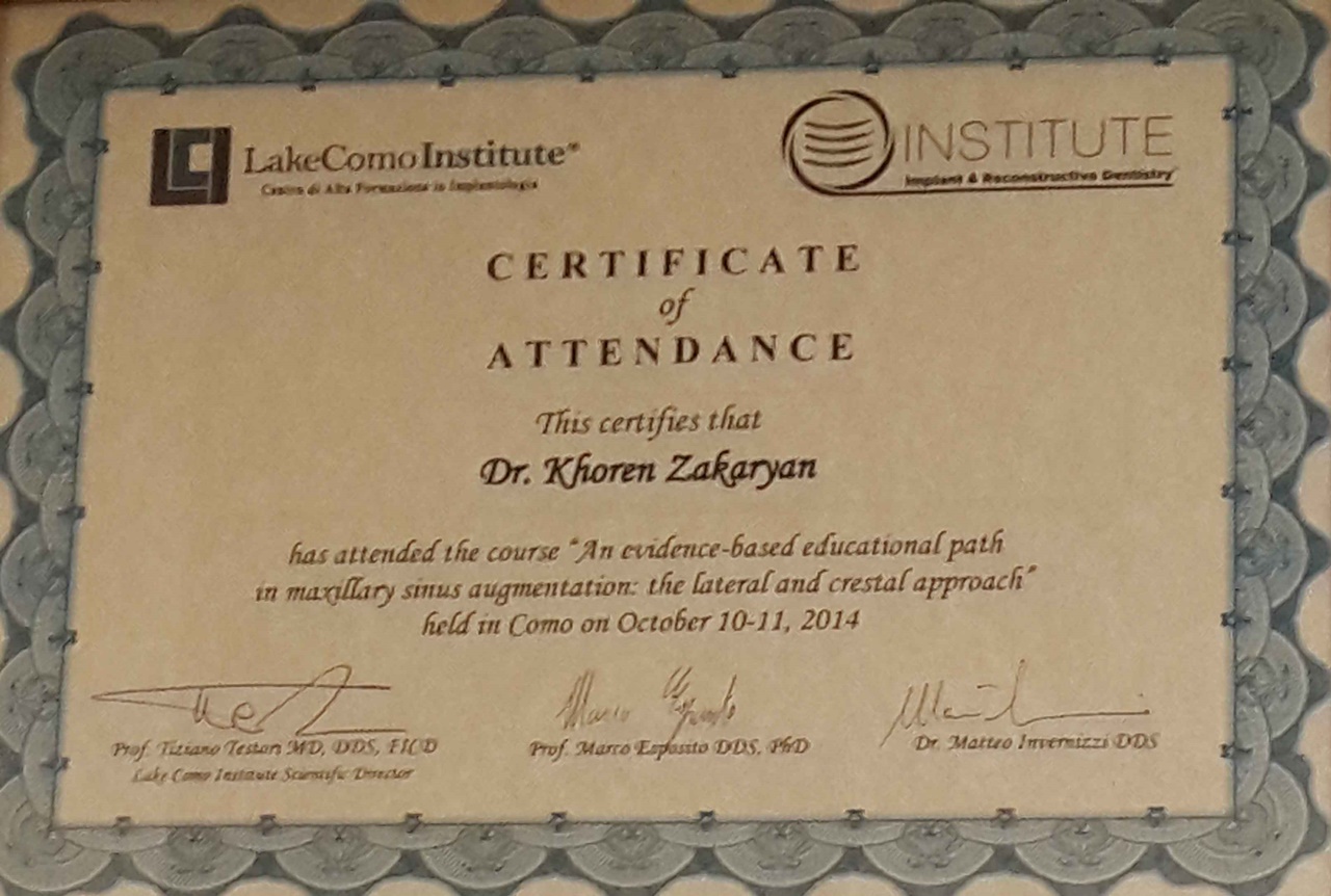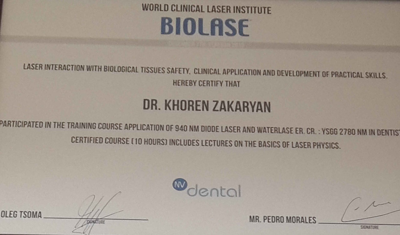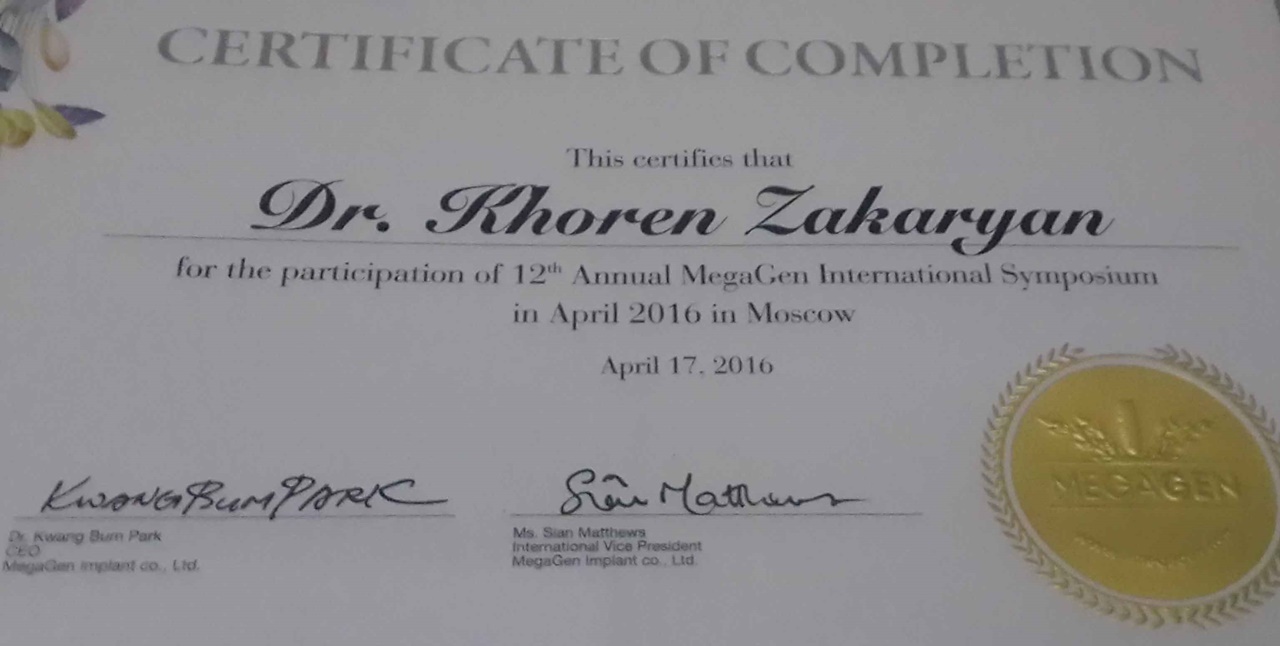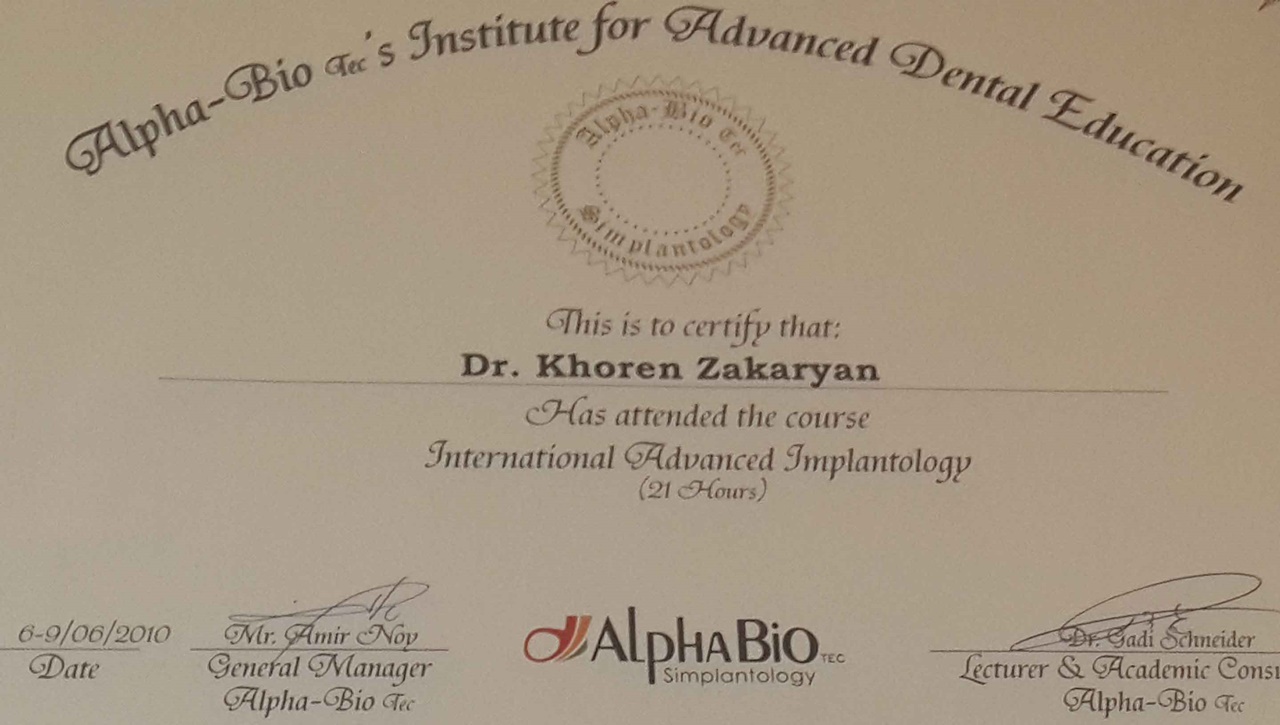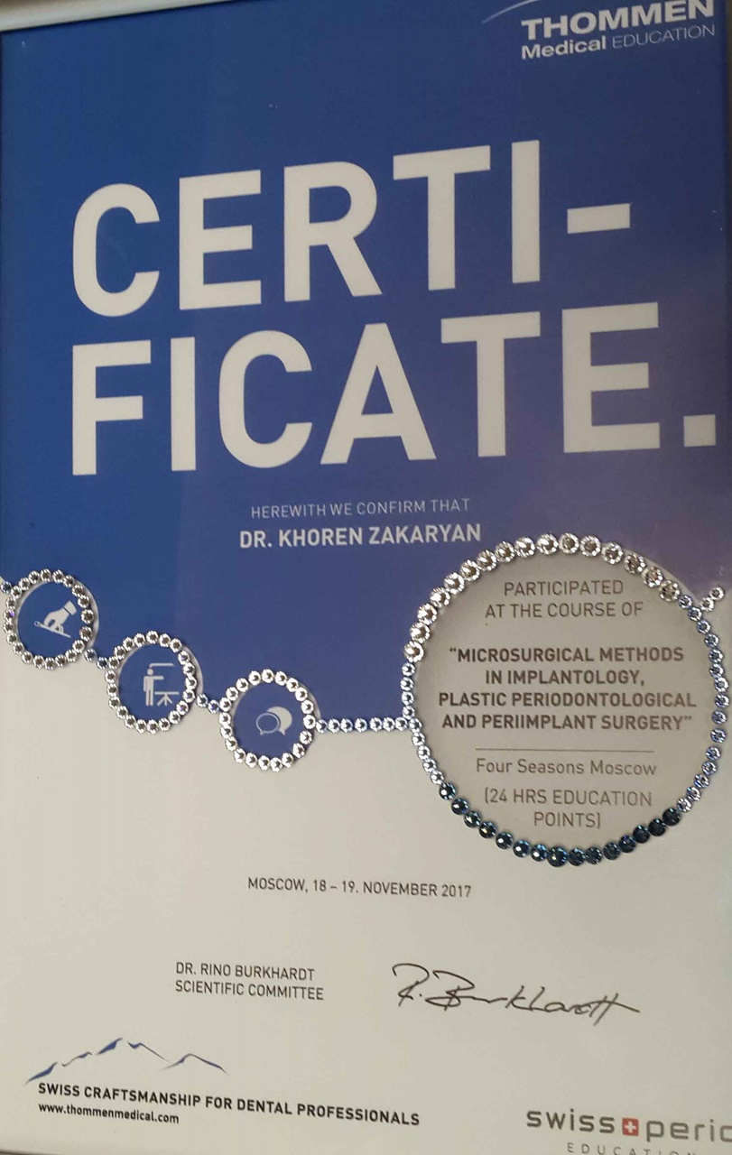 Dr. Khoren Ruslan Zakaryan graduated from the Department of Dentistry of the Yerevan State Medical University after Mkhitar Heratsi, in 1988, and the Clinical Residency at the same Department, in 1989. Further education and major training includes: