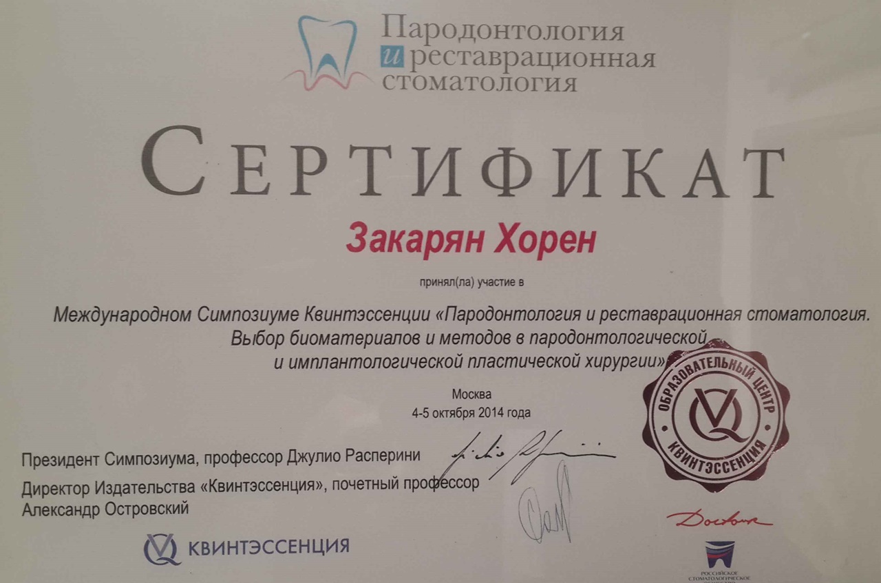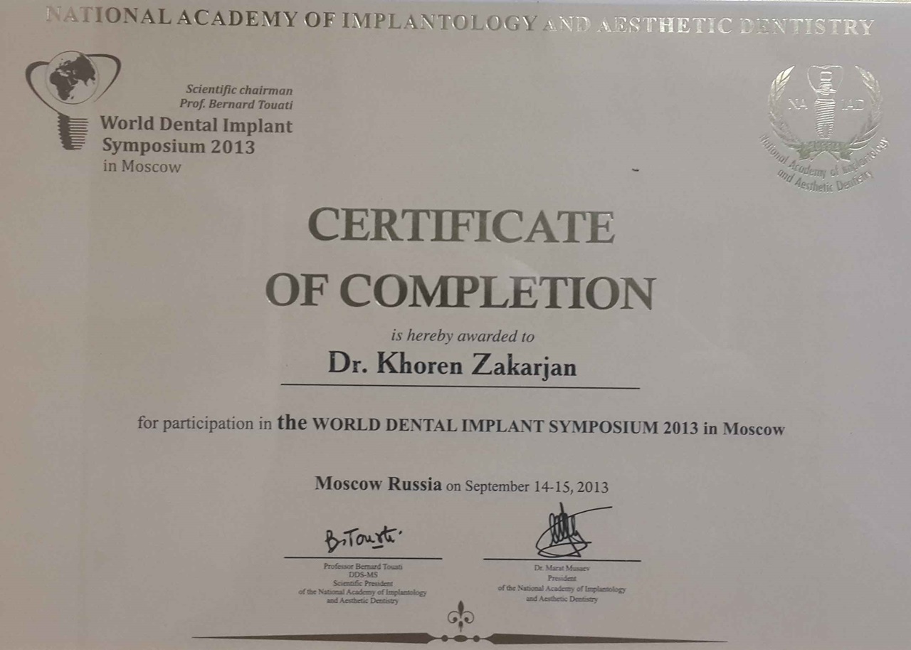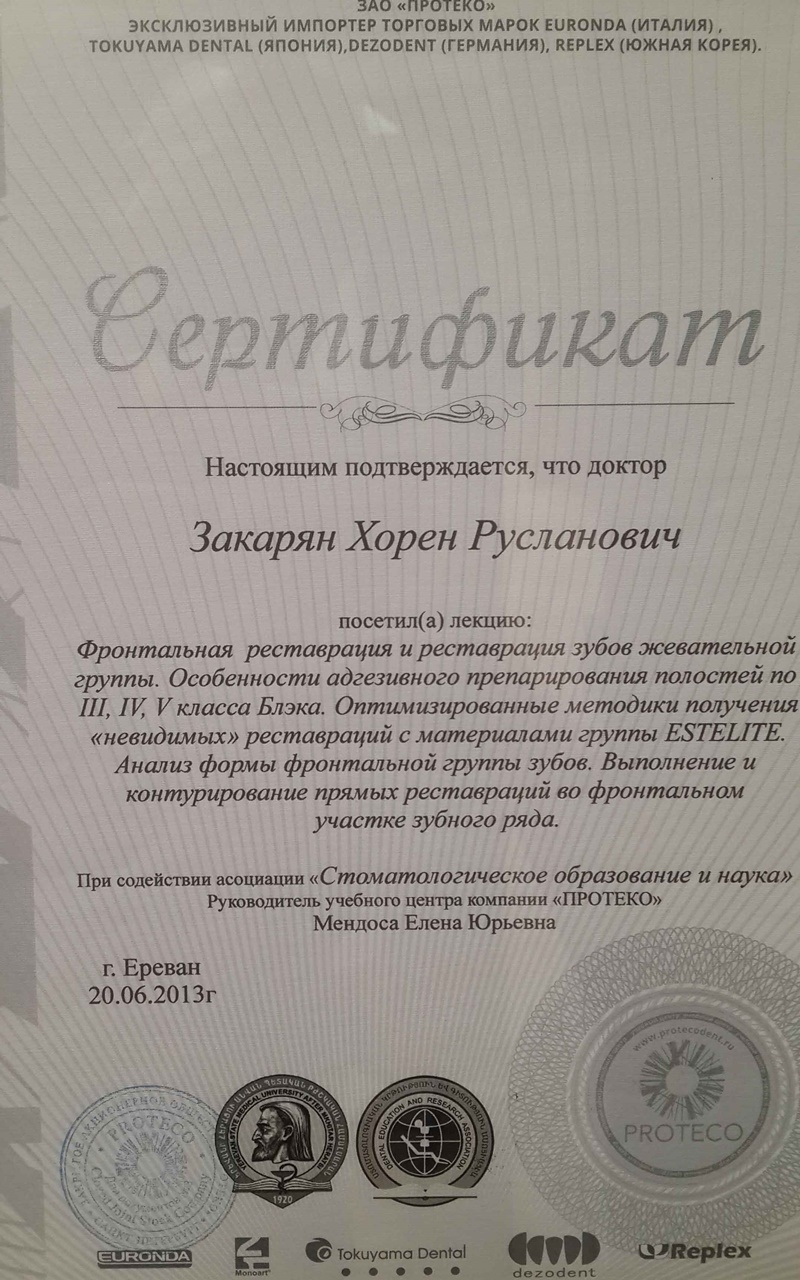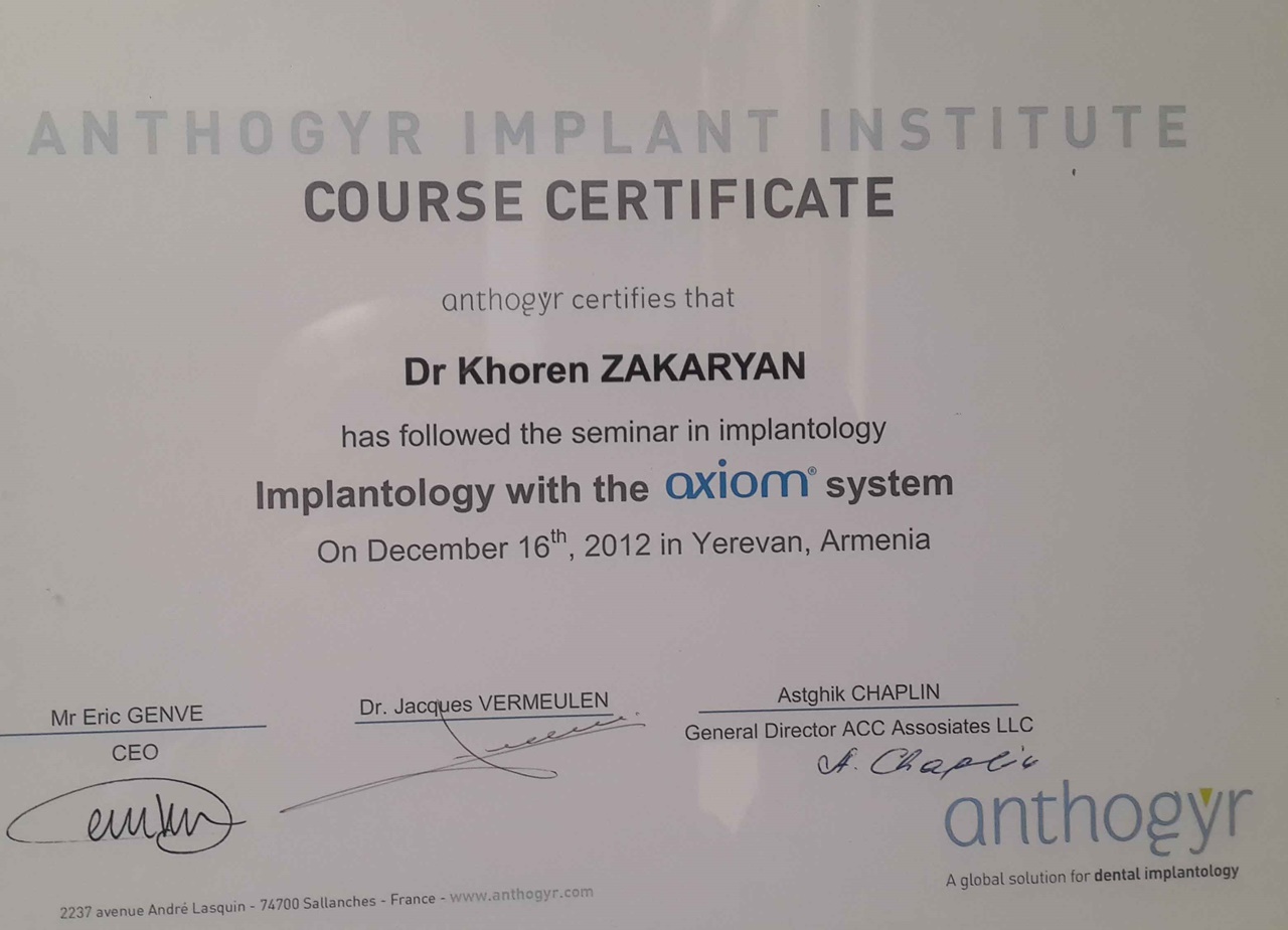 Dr. Khoren Ruslan Zakaryan graduated from the Department of Dentistry of the Yerevan State Medical University after Mkhitar Heratsi, in 1988, and the Clinical Residency at the same Department, in 1989. Further education and major training includes: