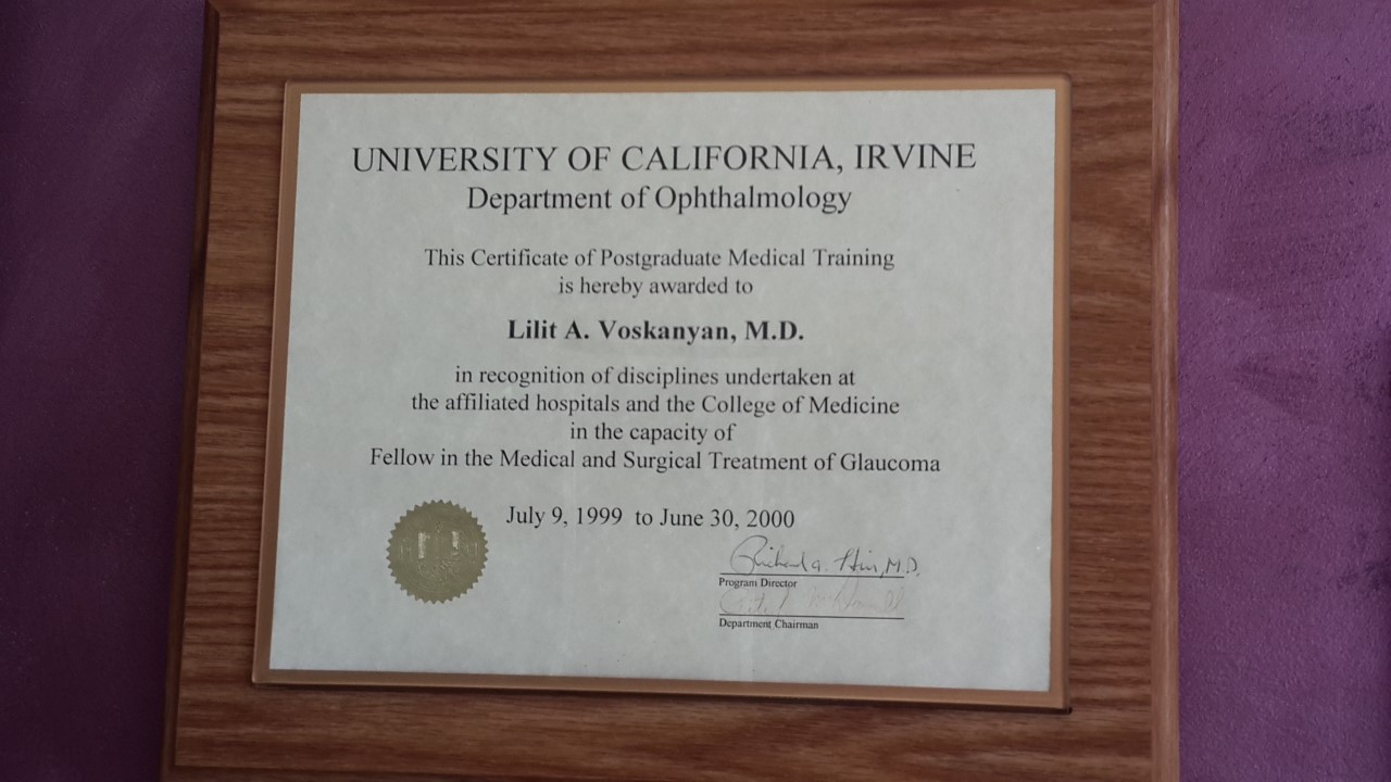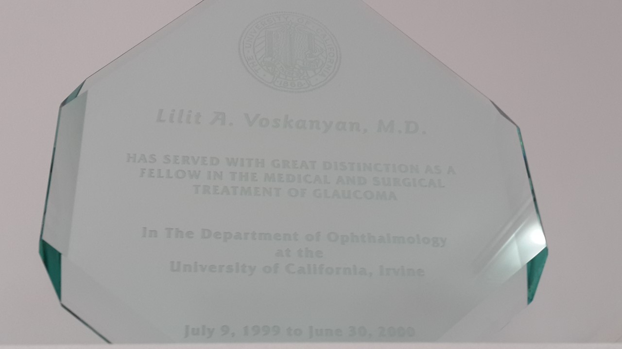 In 1999, Dr. Voskyanyan was selected as an AECP-AAMOS Scholar and did a one-year Research Fellowship in the Medical and Surgical Treatment of Glaucoma at the University of California, Irvine, with Dr. Richard Hill, the director.