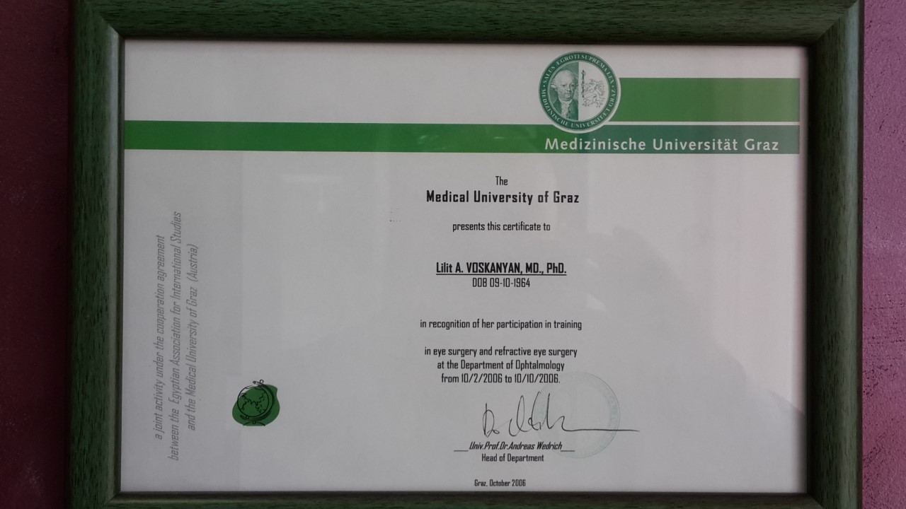 Dr. Voskanyan attended the Yerevan State University Medical Facility, 1972-1978, receiving her Diploma of Doctoring with Honors. She did her three-year surgical residency, 1988-1991, receiving a Certificate of Ophthalmologist, with Honors, from the Ordinatura Eye Diseases & Microsurgery Center in Yerevan. Seven years of training followed, from 1991 to 1998, in the Glaucoma Department at the Republican Eye Hospital (now the Malayan Ophthalmological Center.)