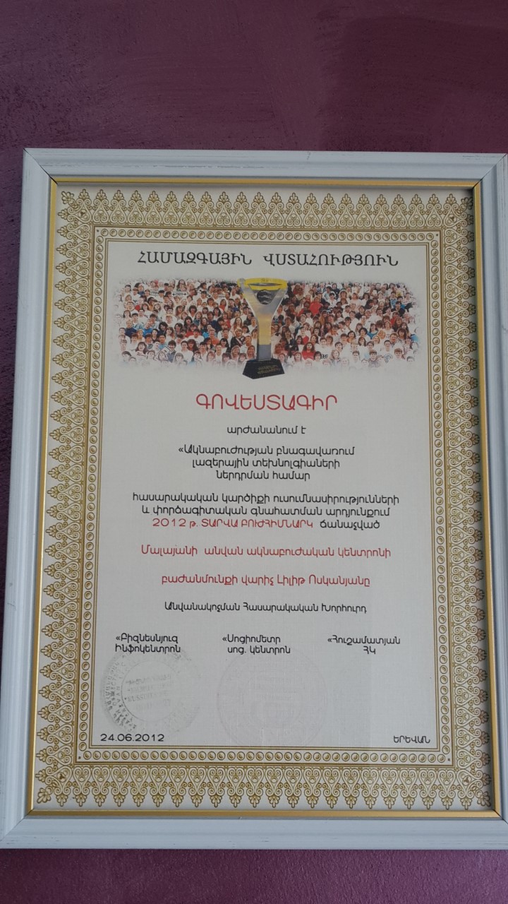 Dr. Voskanyan started her medical practice in 1990, as ophthalmologist at Ophthalmological Center after S. V. Malayan. Since 2001 she is the head of Glaucoma Department in the same Center.