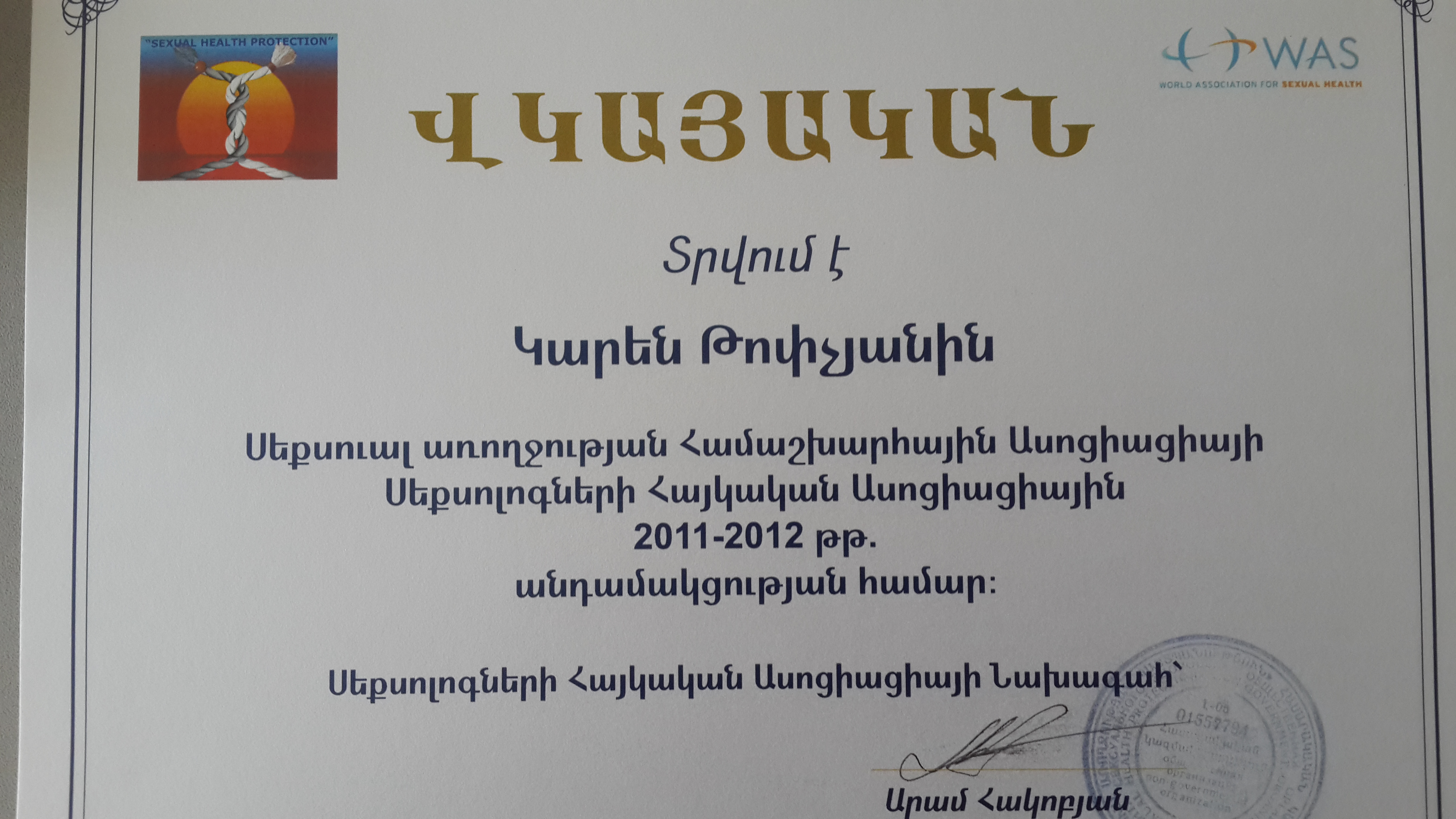 In 2013 Dr. Karen Topchyan received special honor with certificate of the Best Sexologist of the year.