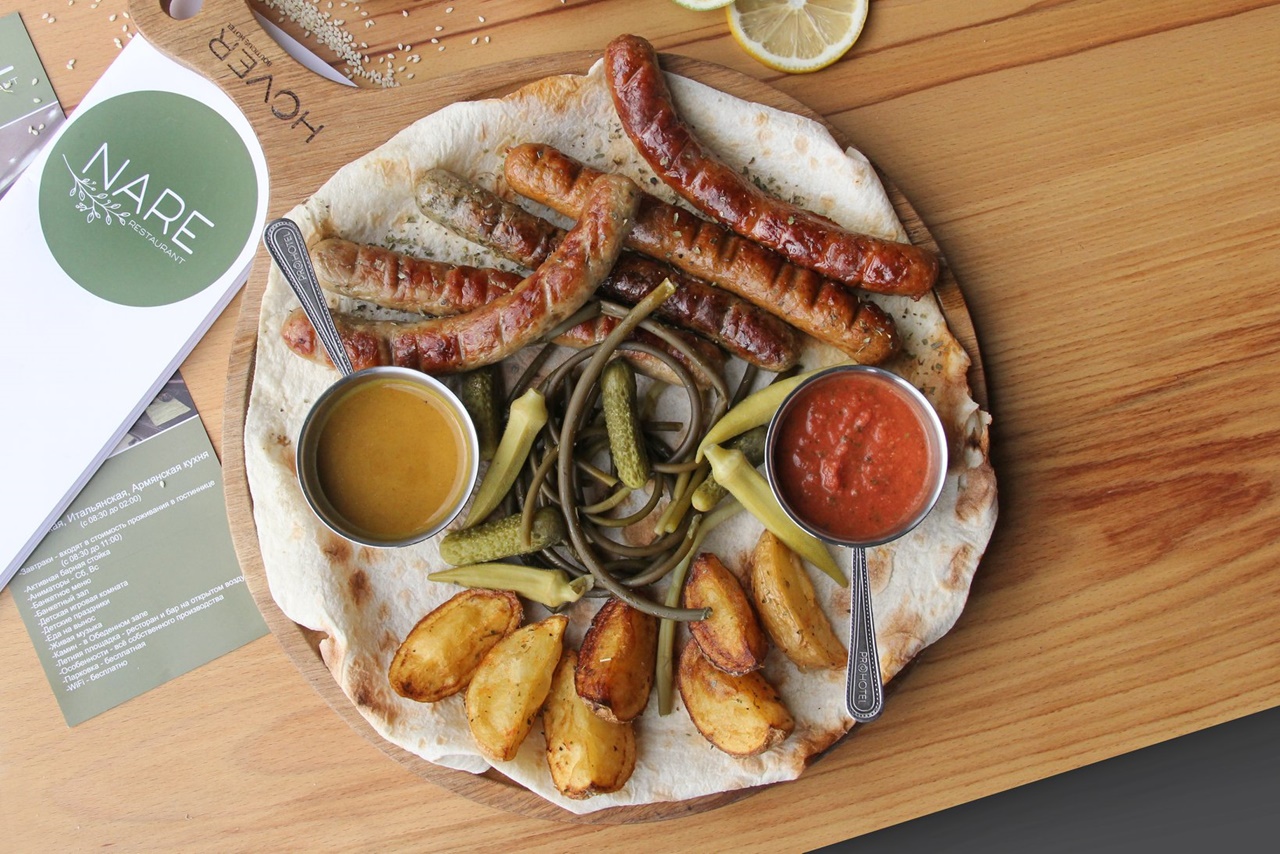 The NARE restaurant has a wide variety of Armenian and international dishes, but it is especially famous for its natural, homemade sausages. In addition, here you can try Italian pizza, Pesto Penne with a unique and delicate taste, Chateubrind Steak, French style veal Fillet, and, of course the famous Armenian summer TOLMA (DOLMA), Veal in crockpot, HARISA, Dolma in grape leaves, Trout from Chef, Dilijan Crockpot (lamb), lamb shoulder with spelt wheat, and other delicious food. Here you will also find a very wide range of different drinks, including the famous Armenian brandy, wines, beer, and local fruit distillates.